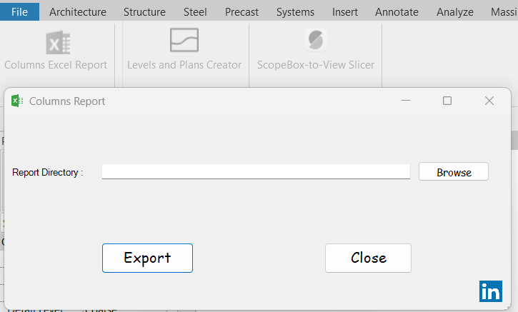 This feature allows users to export detailed information about all structural columns in the Autodesk® Revit® project to an Excel spreadsheet. The information can include column type, dimensions, material, location, and other relevant parameters.