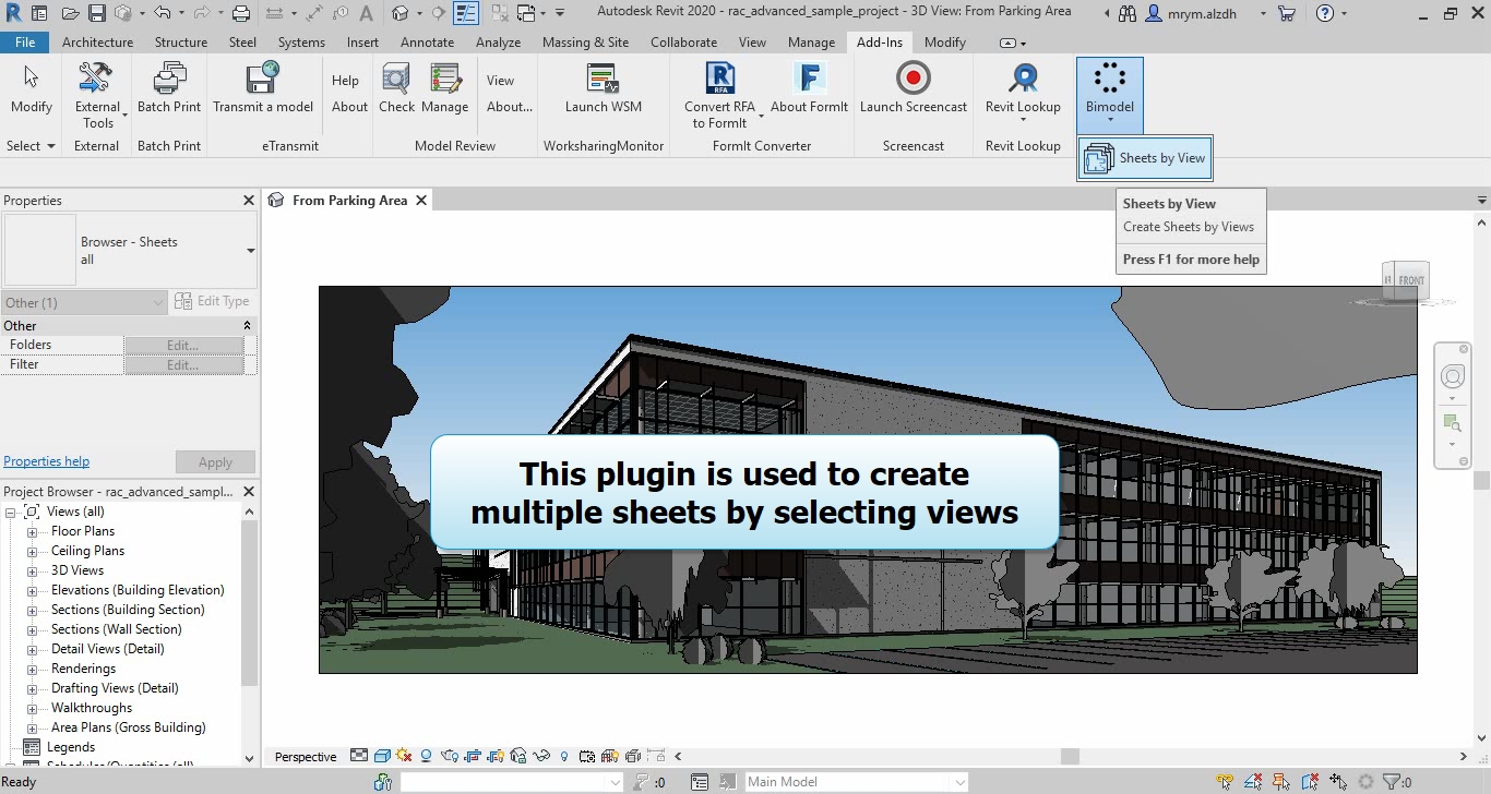 NOTICE: During running this plugin you could use Revit and modify your model (It uses modeless forms). However, you could not edit the views or sheet names and numbers, or delete them (If you do, Revit will show you an error to prevent unwanted changes).