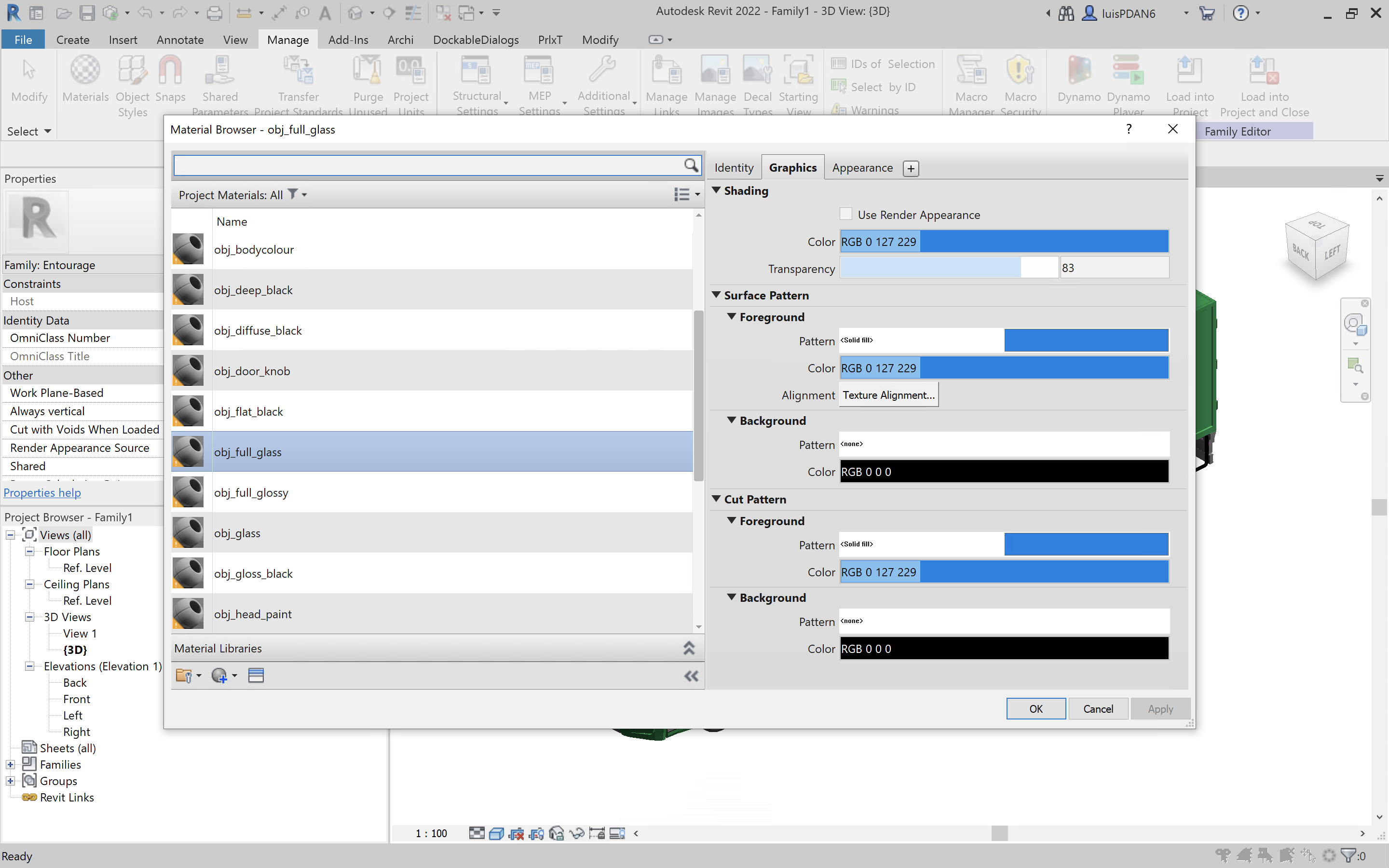 - The imported objects get sorted by matching Revit materials, including the colour and transparency information.