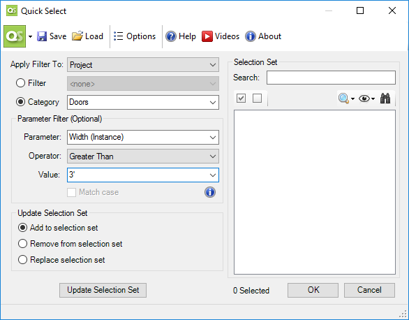 This tool quickly changes which elements are selected by using filters for categories, parameter values, and views.