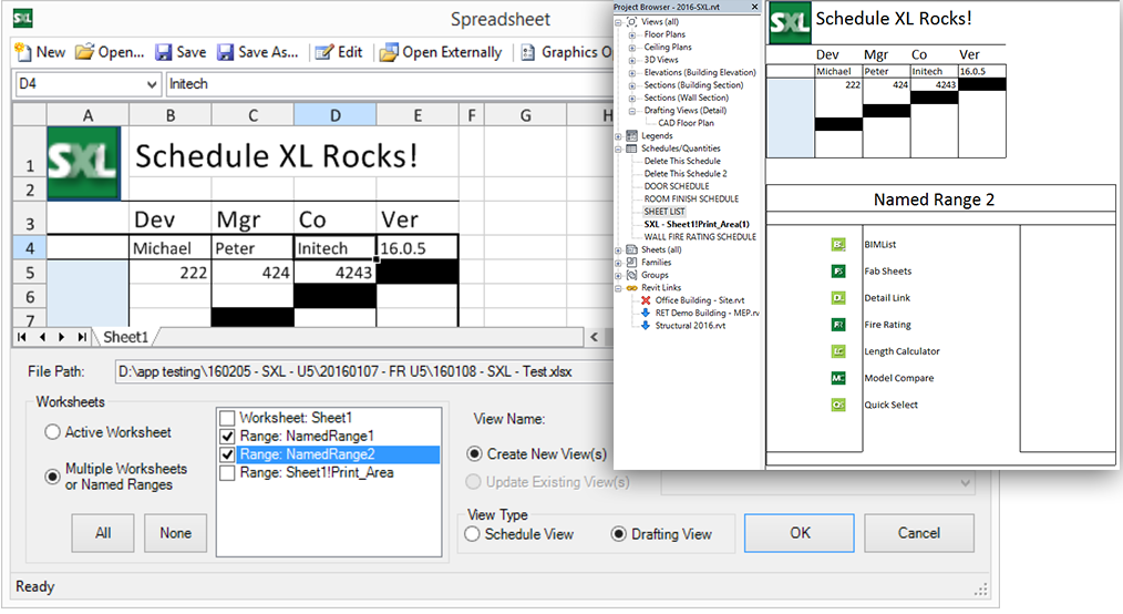 This tool will create one or more schedule or drafting views from one or more spreadsheet worksheets, allowing automatic updates when opening the project.