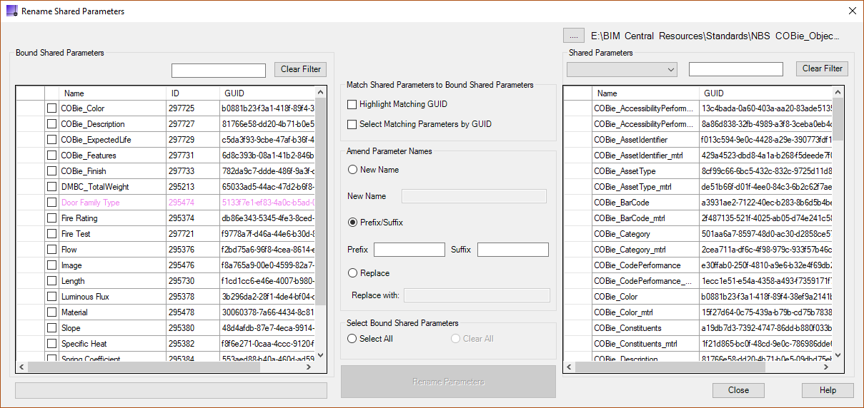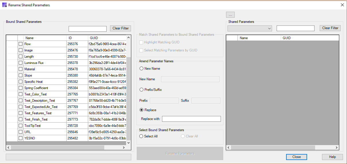 Individual bound shared parameter names can be completely changed or multiple parameters can have a Suffix and/ or Prefix added to the name. As well as retaining the parameter formula, the parameters also retain their GUID.