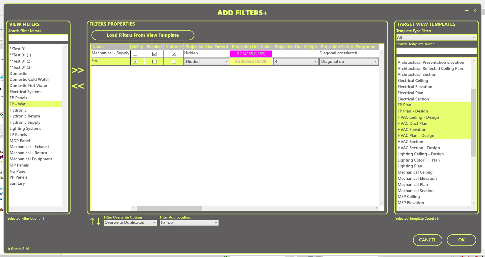 One of the most powerful and versatile features of Autodesk® Revit® is the use of view filters. View filters allow for highly customizable methods for controlling the visibility and graphics of elements within Revit. At GeminiBIM, we have developed the Add Filters+ add-in to provide Revit users with a streamlined approach to bulk-adding or modifying filters applied to Revit view templates. This add-in alleviates the difficulty of manually adding or modifying view filters assigned to multiple view templates by providing a robust user interface that allows various methods to add or modify filters. You can manually add and configure filters and assign them to multiple view templates or automate the process by copying view filters from an existing Revit template and assigning them to other templates, copying all aspects of visibility control and the graphical setting assigned to the view filter. The Filter+ was designed to provide a simplistic approach to managing view filters within the Revit project environment and will reduce the efforts needed to manage view filters.