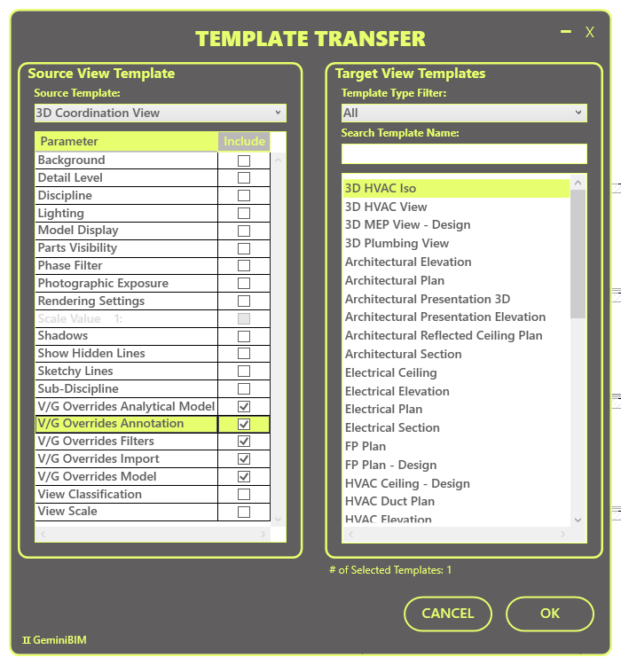 Managing view templates within Revit can be a time-consuming task; ensuring that specific desired settings are consistent across multiple view templates or adjusting settings across numerous templates within a Revit project can pose a challenge. Here at GeminiBIM, we developed the Template Transfer utility that provides an intuitive and efficient method to apply changes across a single view template or multiple templates in a Revit project by specifying a source view template and settings to transfer from and target view templates to modify. The Template Transfer utility provides a method to foster greater consistency and reduces the efforts needed to modify view templates within the project environment.