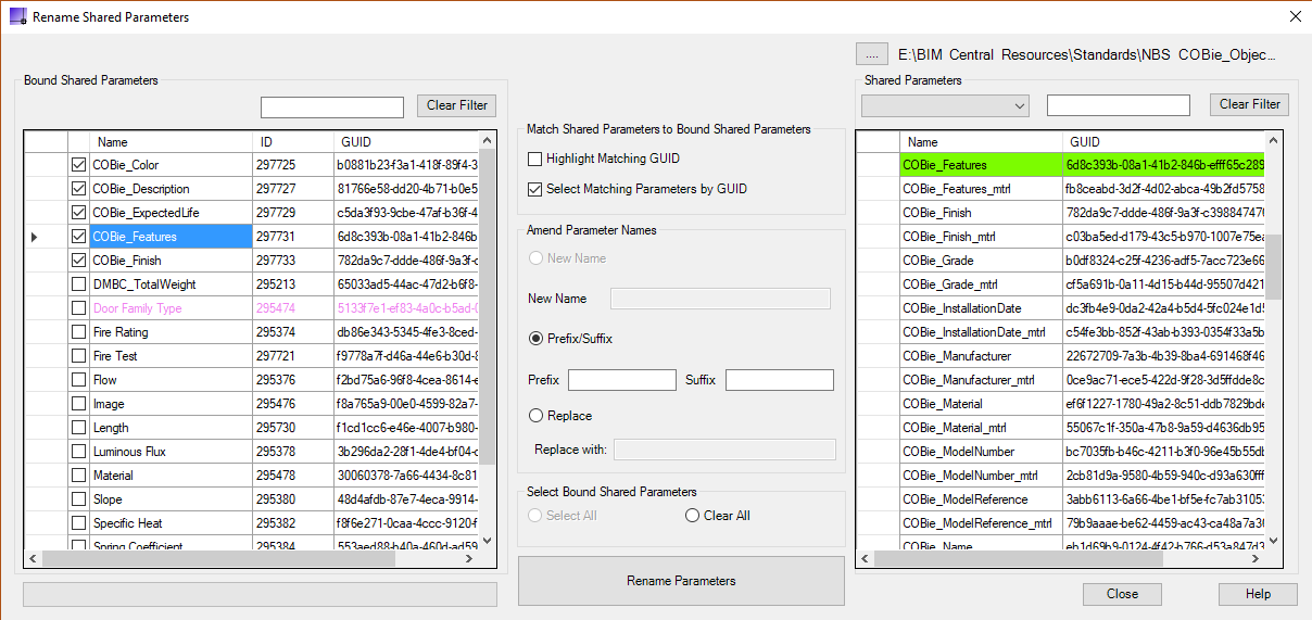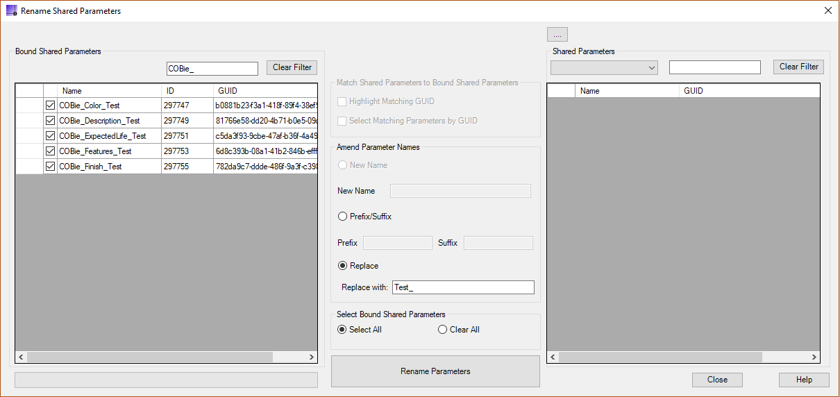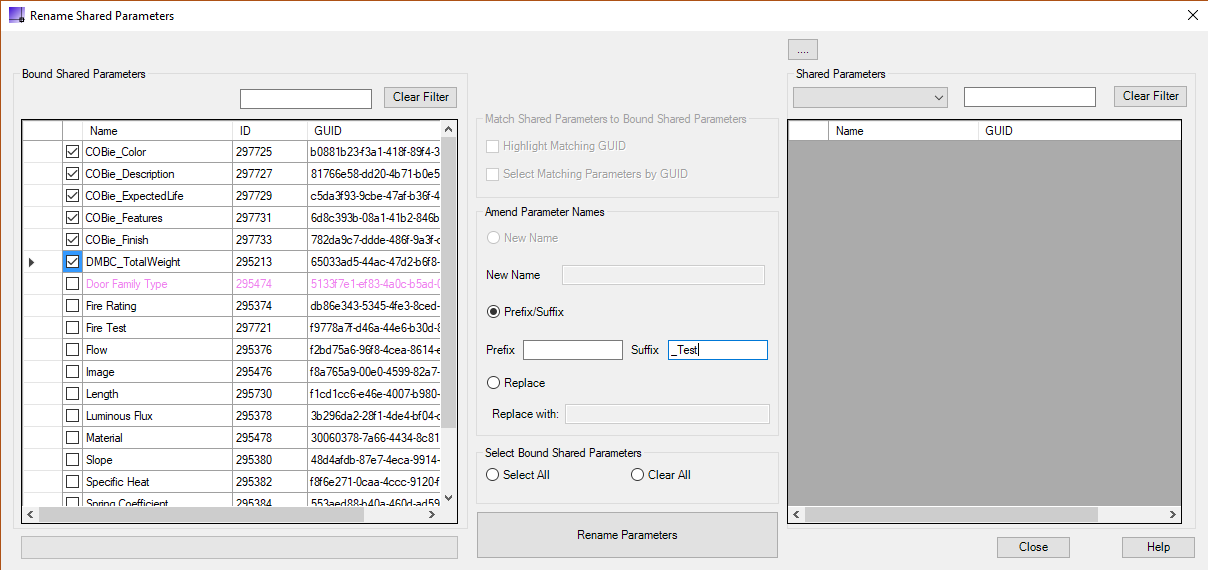 Individual bound shared parameter names can be completely changed or multiple parameters can have a Suffix and/ or Prefix added to the name. As well as retaining the parameter formula, the parameters also retain their GUID.