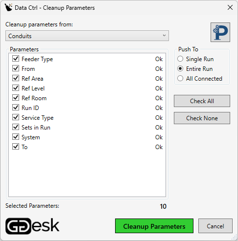 Data Ctrl automatically pushes parametric information through the entire MEP network, maintaining up-to-date parameter values as you modify the network's elements. For electrical networks such as conduits and cable trays, Data Ctrl pushes the parameter values to the Run Schedule. If any changes are made to the Run Schedule, they are transferred accordingly to the conduit or cable tray network.