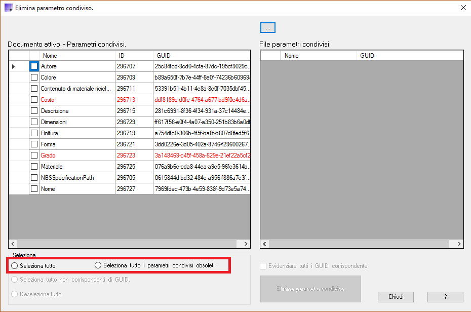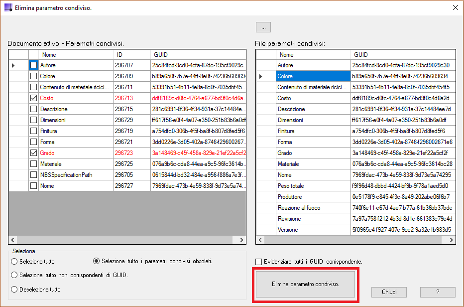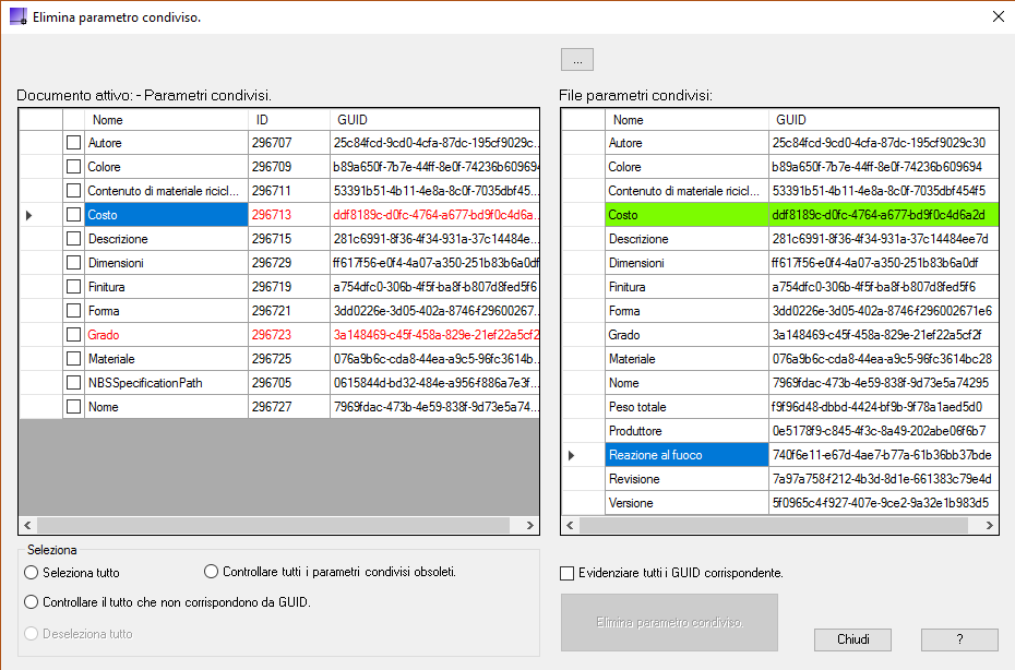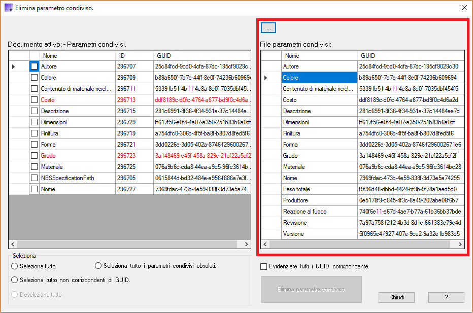 Puoi anche aprire il file dei parametri condivisi nell'App per confrontarlo con il documento attivo facilitando così una facile identificazione dei parametri da aggiungere, risparmiando potenzialmente ore di lavoro.