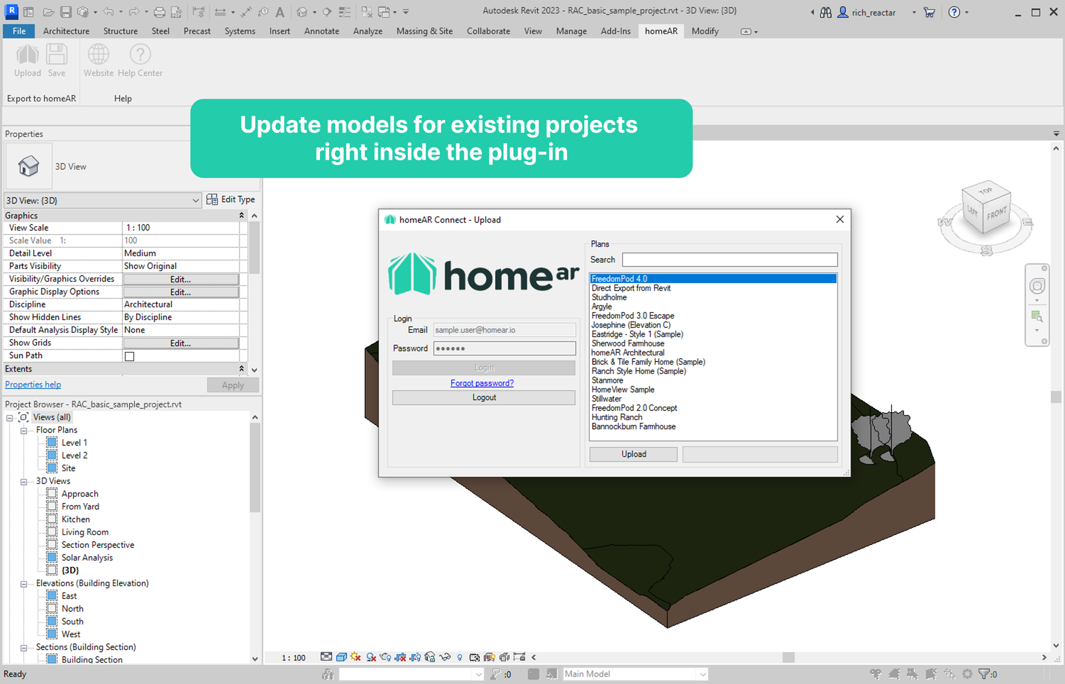 homeAR connect provides both direct publishing and export/upload from Autodesk® Revit® to the homeAR web portal where your models are optimized for AR and then published in the homeAR mobile apps