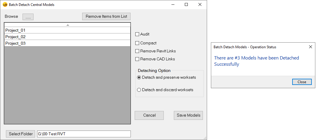 Batch Detach Models is a powerful tool meticulously crafted to streamline your workflow by automatically detaching multiple work-shared or non-work-shared models with unparalleled efficiency. With just a few clicks, this indispensable add-in liberates your models and seamlessly saves them to your preferred destination, saving you valuable time and effort on every project.