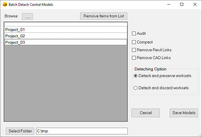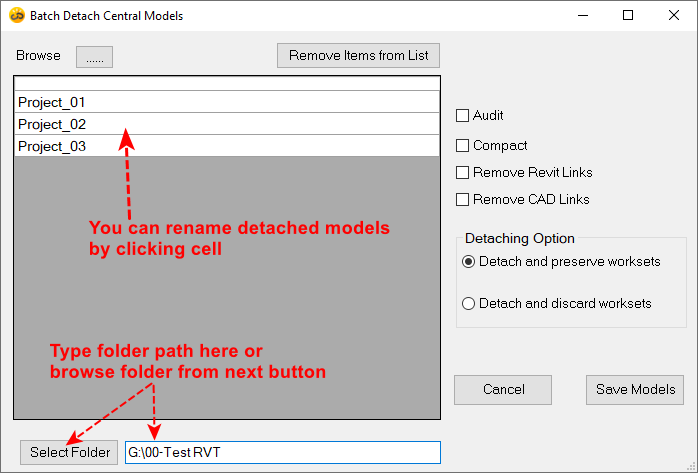 Flexible Saving Options: Save detached models to your preferred destination effortlessly, whether it's at their current location or any custom path of your choice.