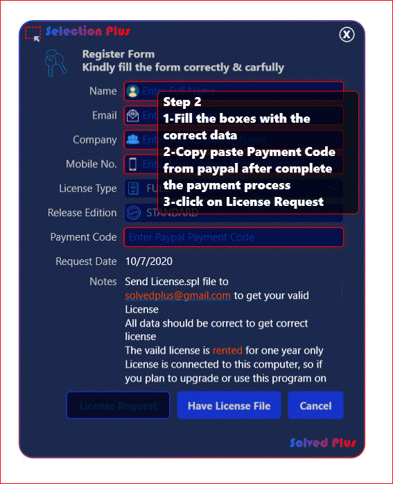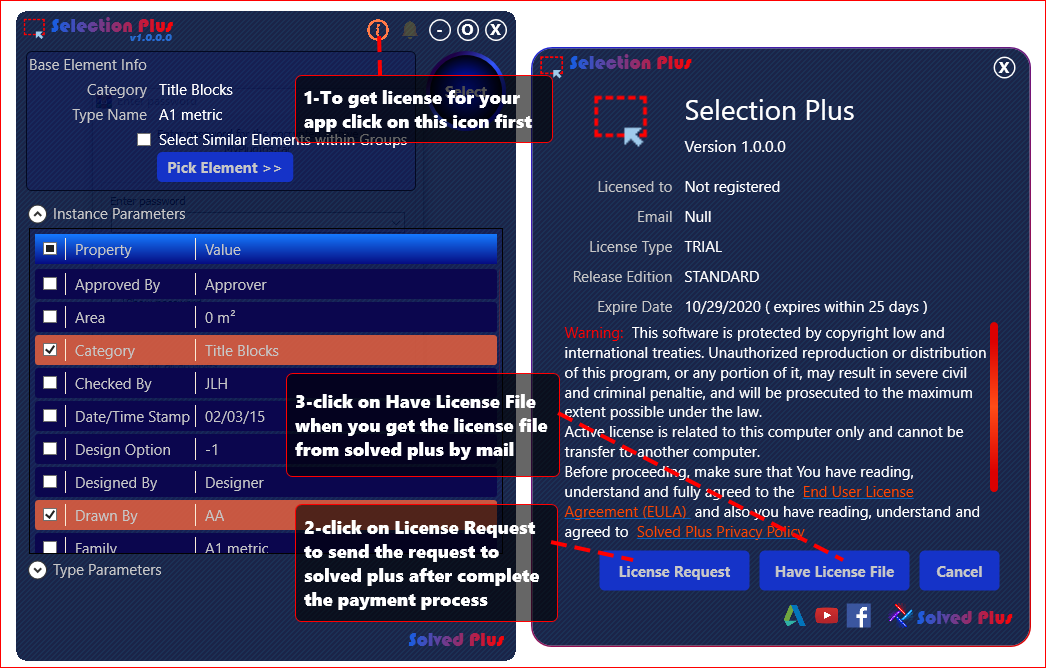 The app is free for the 30-day trial, during which the user can purchase the app from the store via the PayPal payment method & click on the “License request” button available on the Selection Plus app window & fill in the details & submit, you will receive the valid license in 4 working days. so the user can purchase the app & request the license on or before the 26th day of the trial period to avoid the interruption to use the app post-30-day trial.
