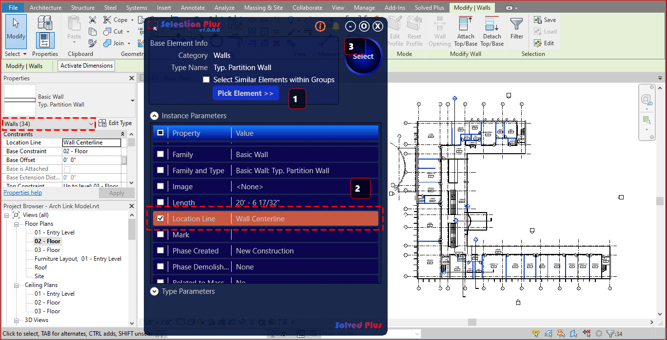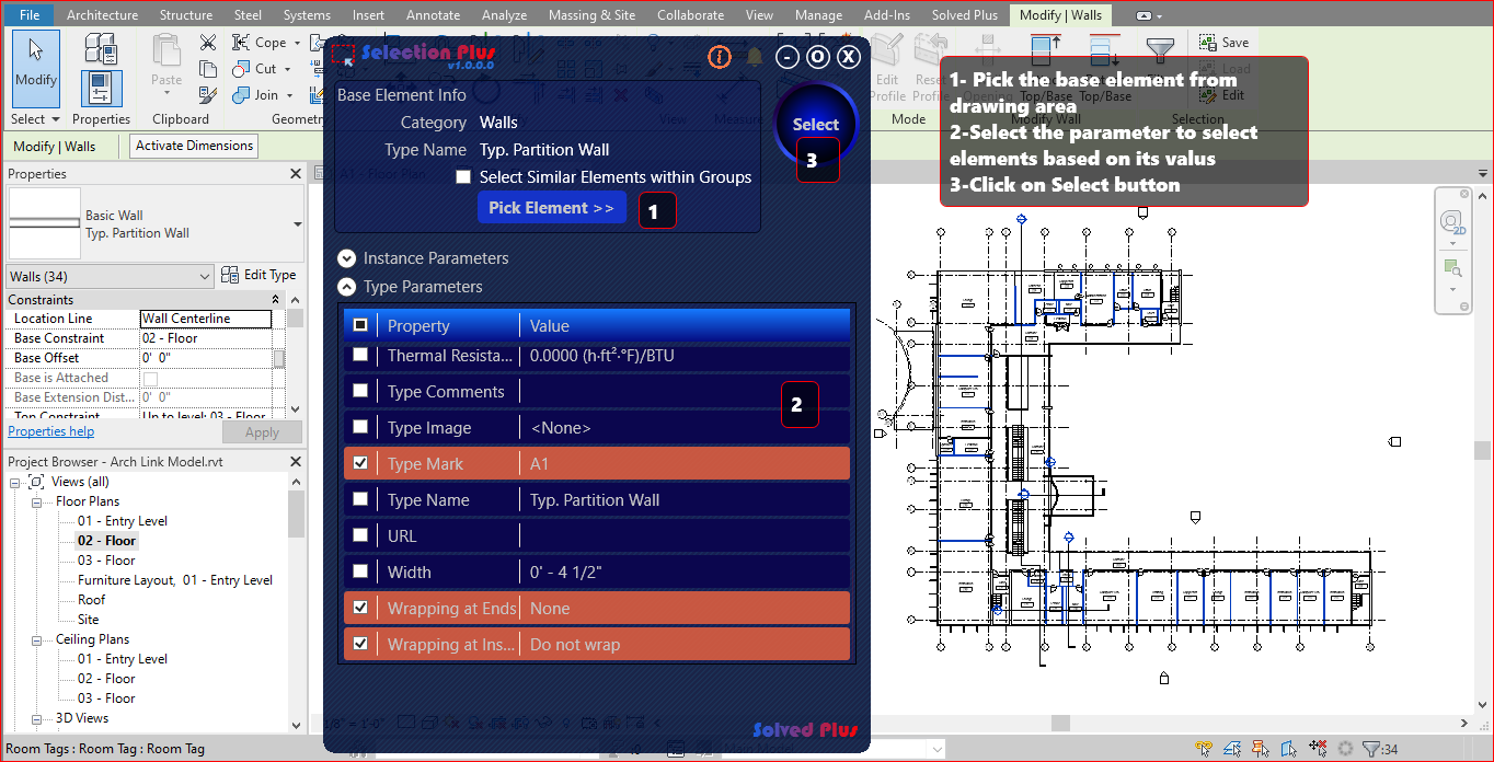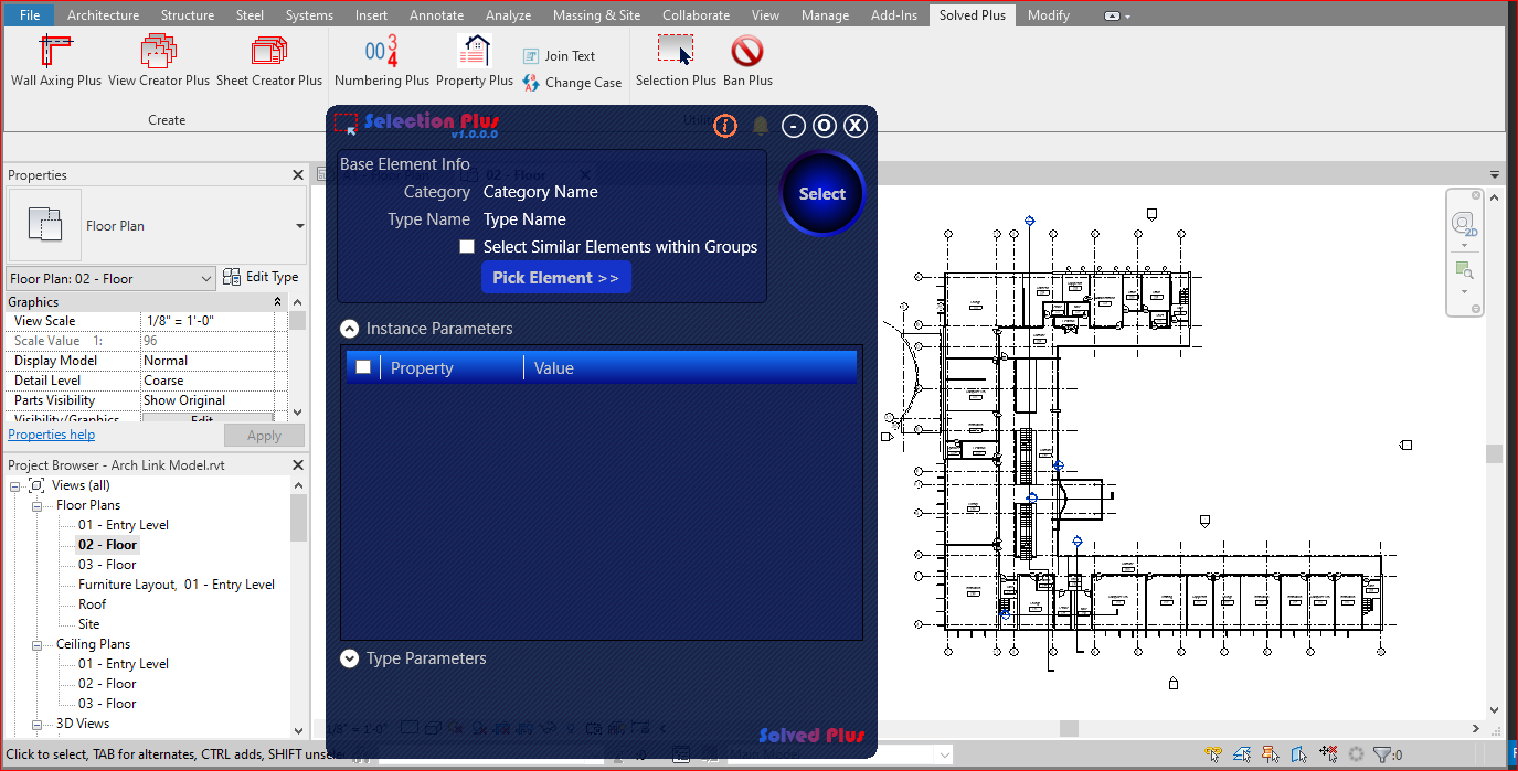 Selection Plus is a handy tool that is used to select any element in the model where the values of their parameters have the same data as values of some selected parameters in the base picked element.