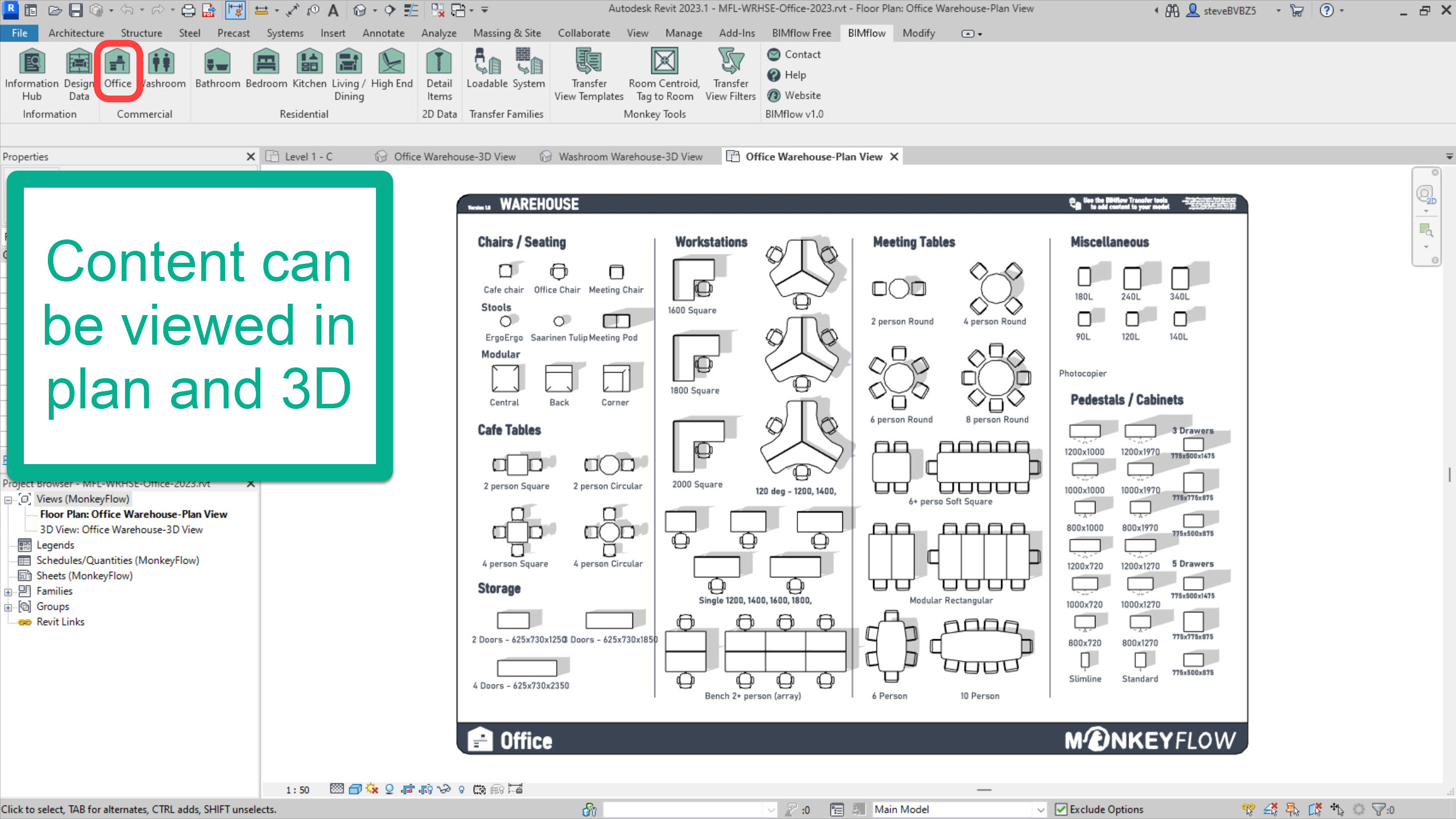Commercial Warehouses: Contains vast collection of Office and Washroom Revit families including chairs, workstations, meeting tables, storage, Doc. M sanitary packs, general sanitary items, cubicles, taps, fittings and more. All content is lightweight and will not bloat your models.