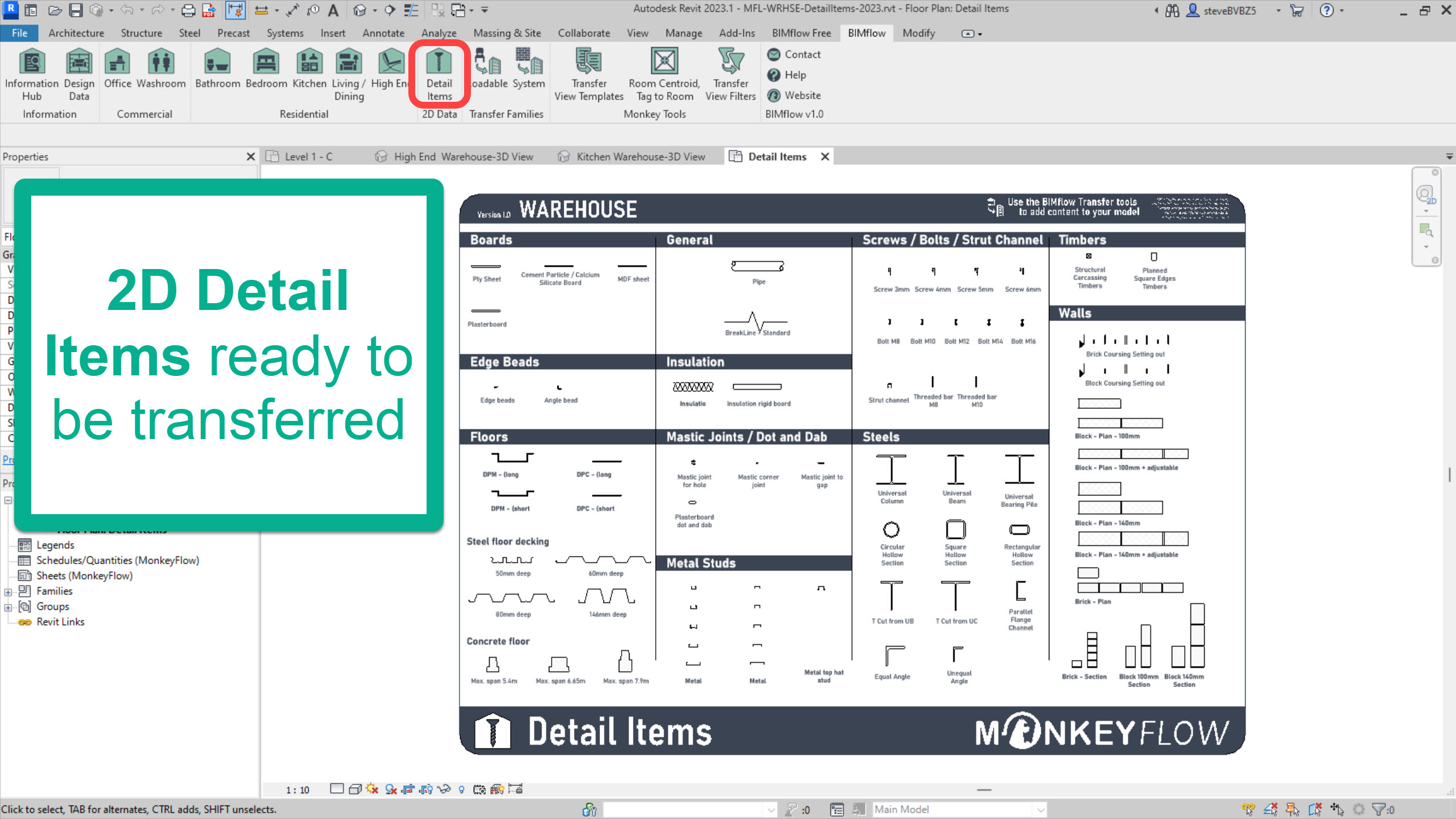 2D Data Warehouse: Contains the Detail Items warehouse with many parametric detail items ready to use including boards, edge beads, insulation, studs, fixings, steels, timbers and more.