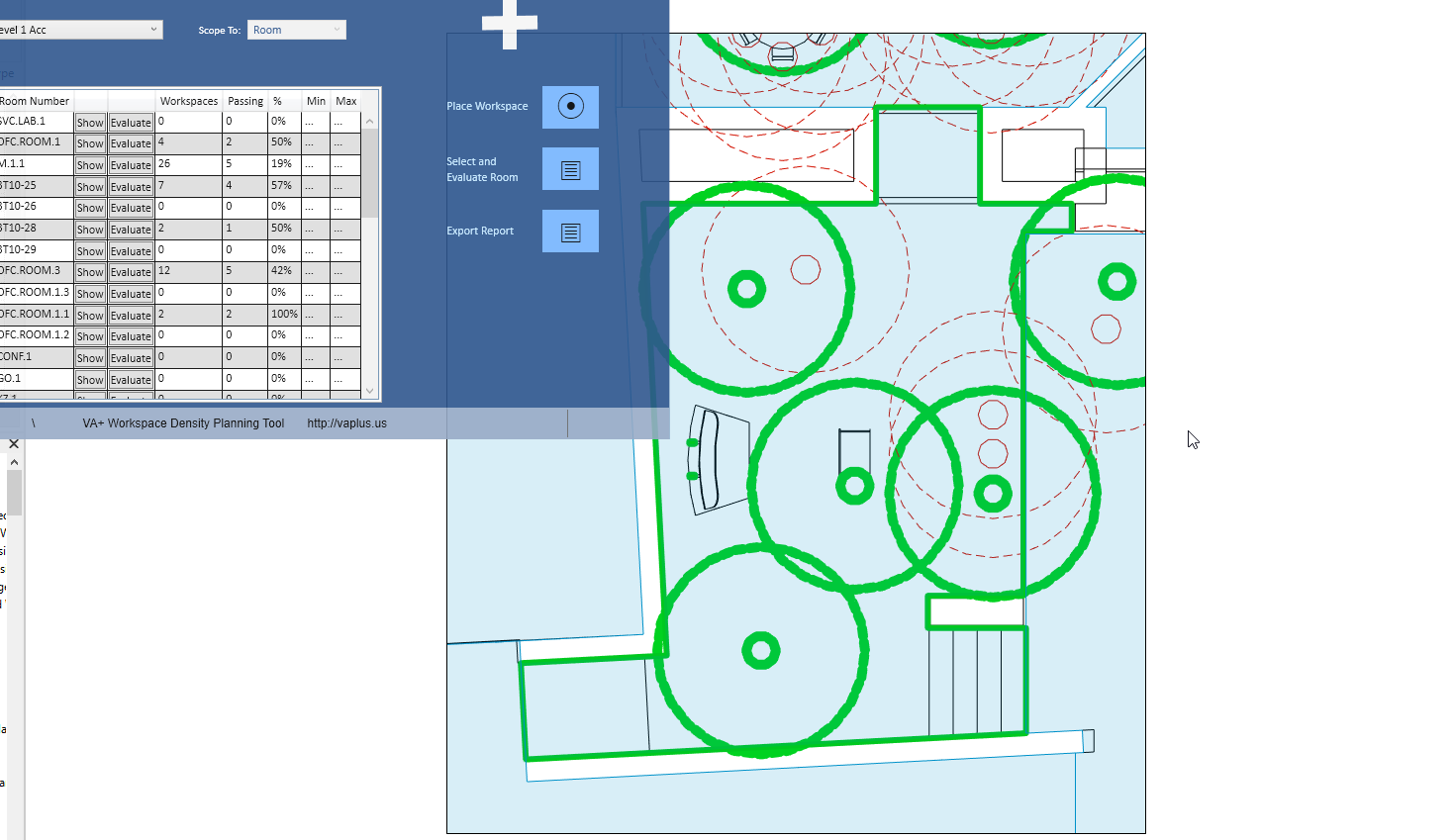 The VA+ COVID-19 Social Distance Planning app analyzes indoor layouts to evaluate social distancing compliance while evaluating re-opening plans during the Covid-19 pandemic. Using a combination of various factors such as distance to doors and clustering, this tool evaluates which layouts are best and which need adjustment.