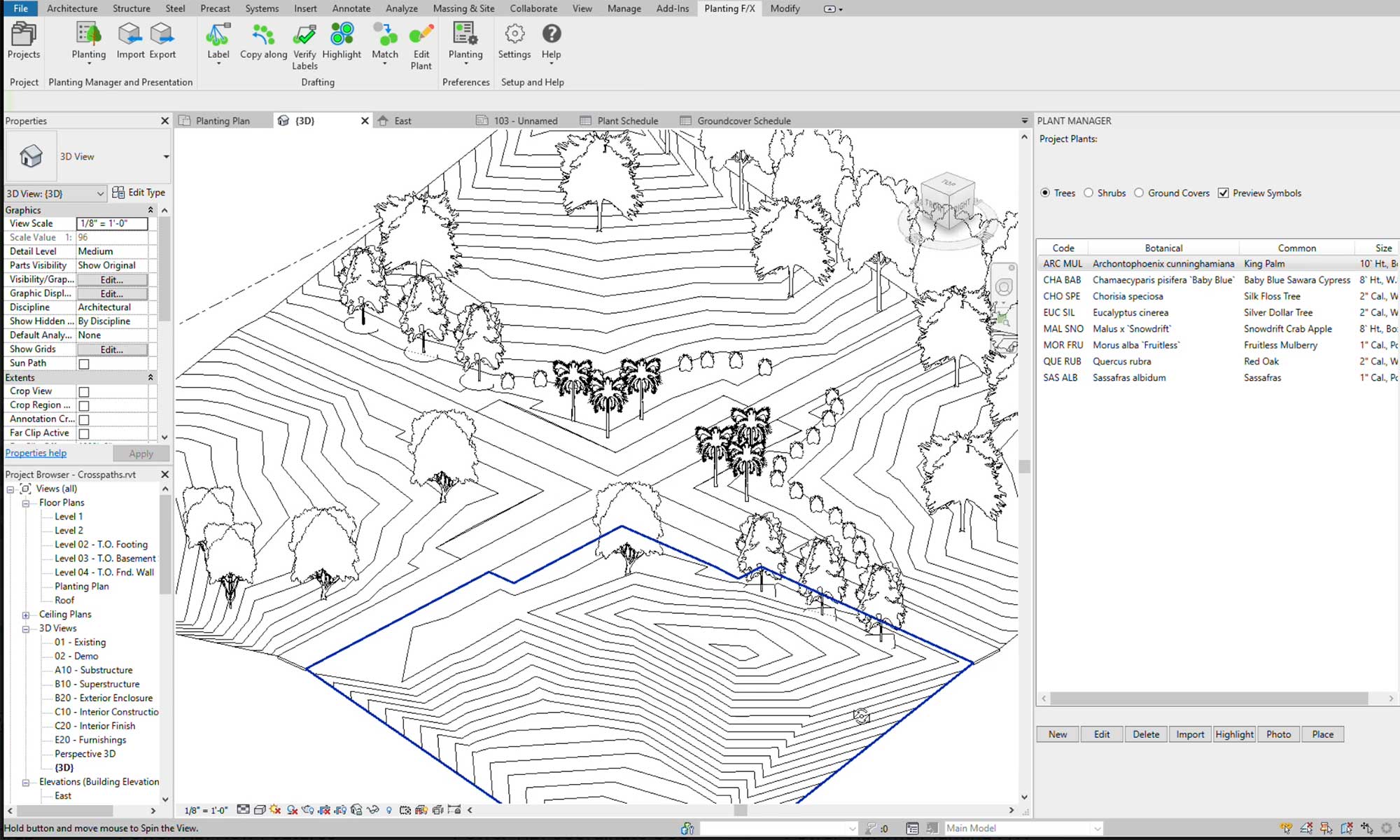 The Planting F/X for Autodesk® Revit® plugin adds planting design–specific tools to automate complex Revit setup, making Revit more accessible for landscape architects and designers, easier to learn for Revit beginners, and faster to use for Revit experts.
