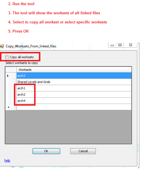 Generally Autodesk® Revit® users have to manually create worksets, This tool will enable you to use any file which contains your old worksets to copy the worksets names from it.