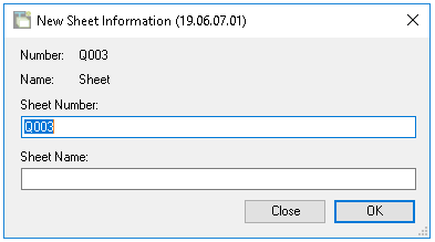 When a New Sheet is created in the model the user will be presented with a pop-up dialog to enter the Sheet Number and the Sheet Name before the Sheet has been created.