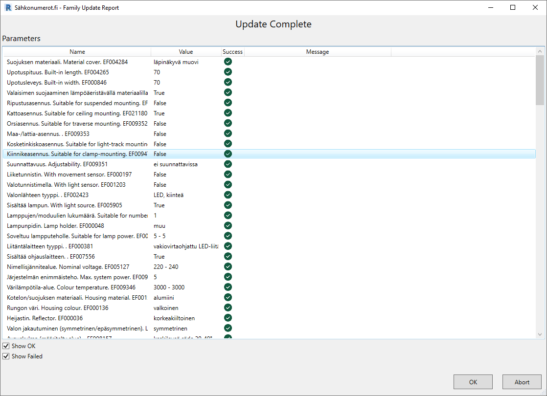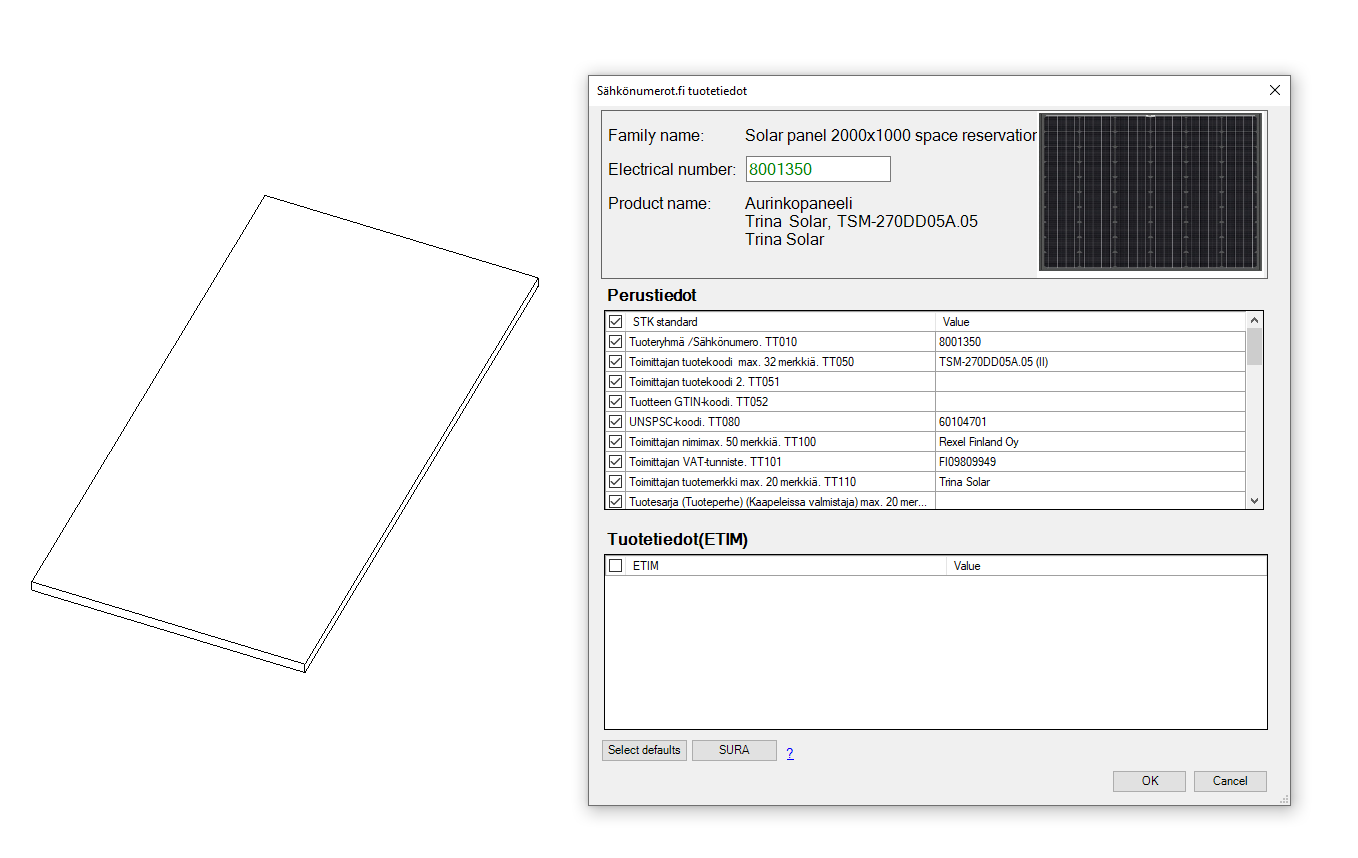 With Sähkönumerot you may import product data from sähkönumerot.fi site as shared parameters to Autodesk® Revit® families. Product information consists of STK product standards and ETIM information. ETIM codes that a product contains depend on its ETIM class. A shared parameter file containing the required parameters is shipped with this tool.