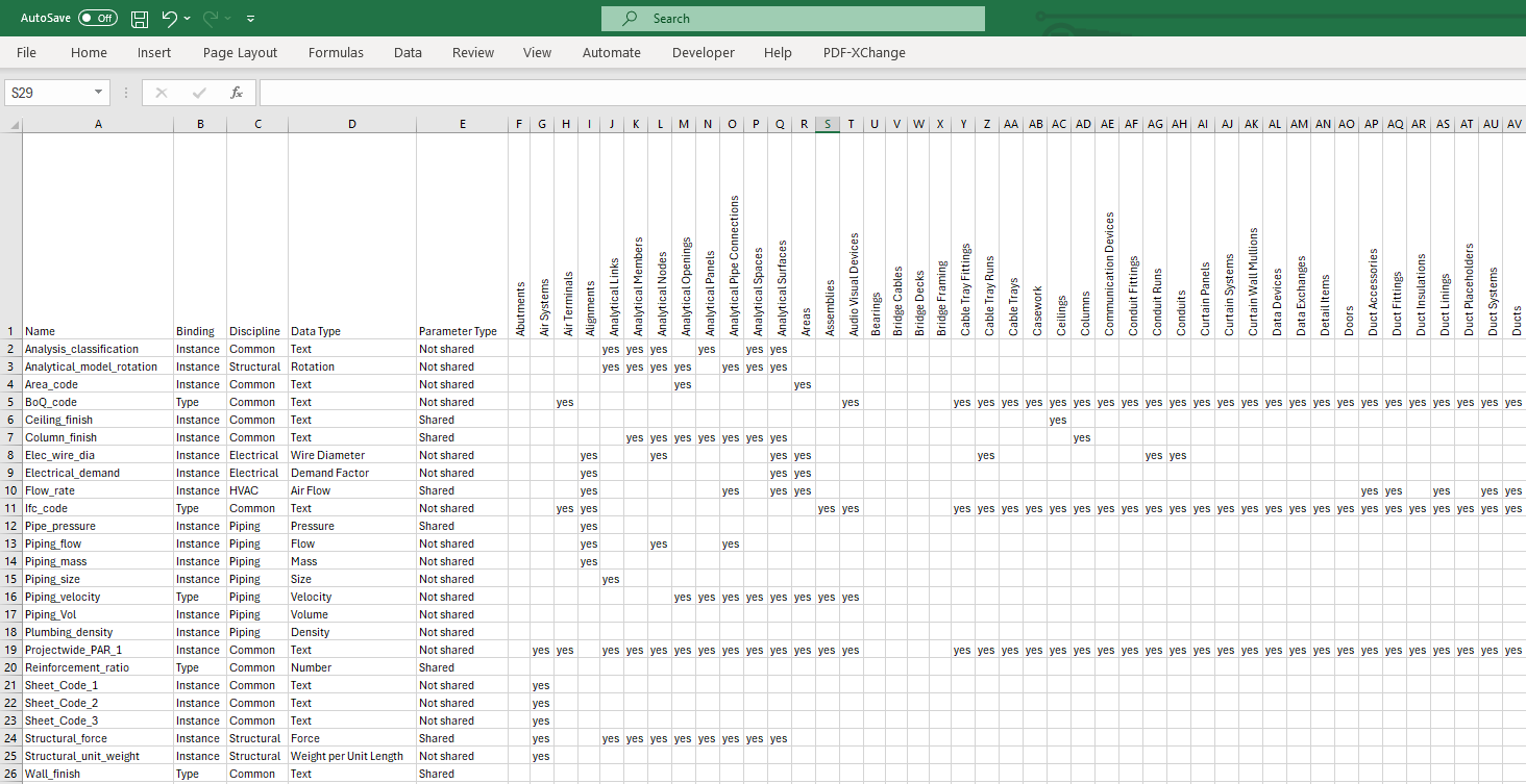 - Step 1: Export table to review project/shared parameters and the categories to which they are assigned to.