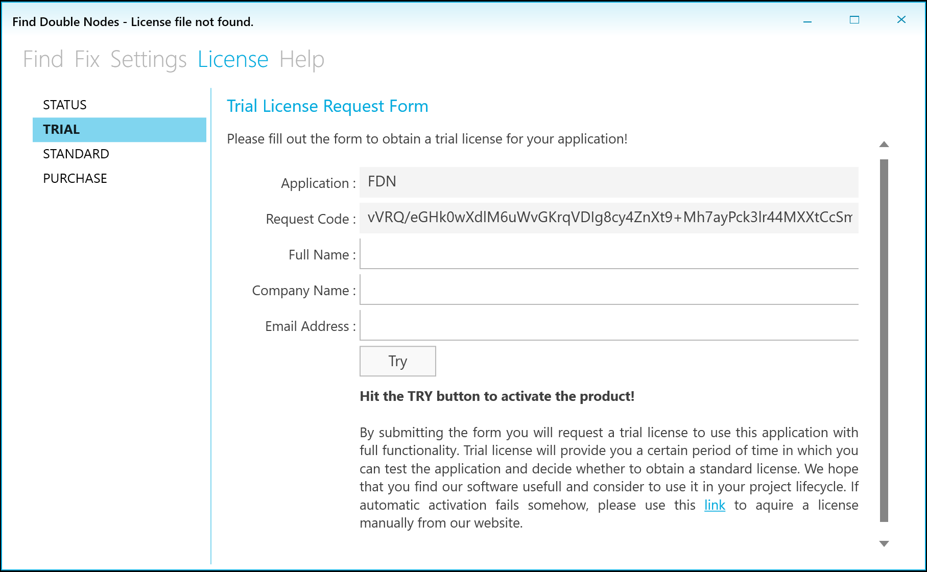 For evaluation purposes, a “Trial License” can be obtained for free. A trial License enables full functionality of the application within a specified time frame, referred to as a “Trial Period”. Please use the in-app Trial Form to submit user information to the license server and activate your copy of FDN. A license is per machine only therefore it will be valid for the application and for the computer that it is issued for.