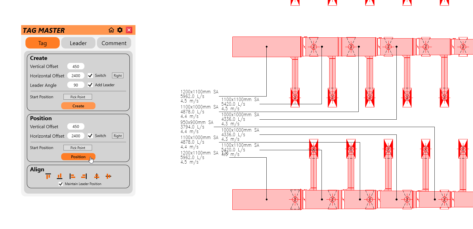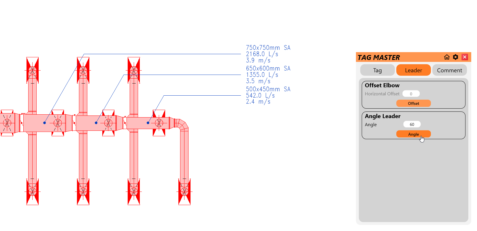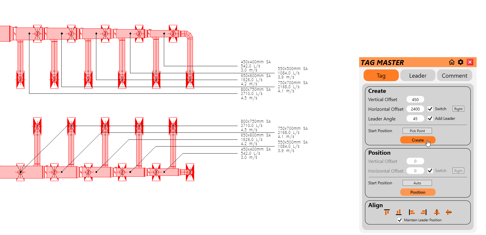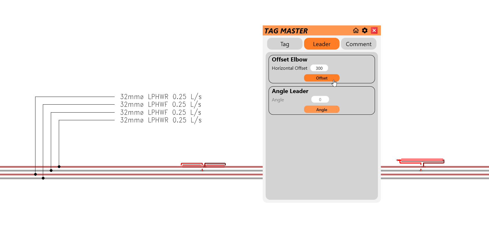Create Tag - Configure the vertical and horizontal offsets, leader angle, and starting position. Then start tagging and let Tag Master handle the positioning.