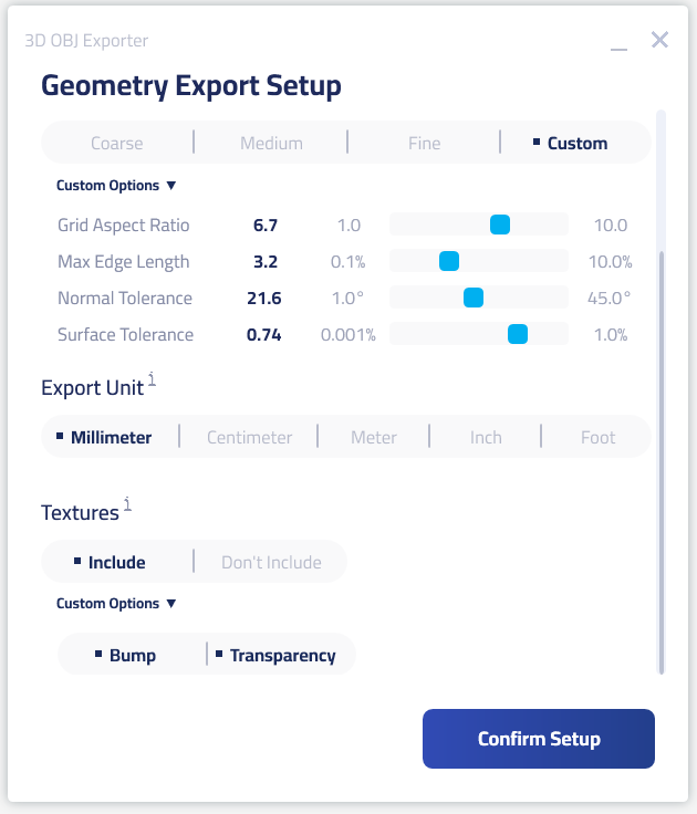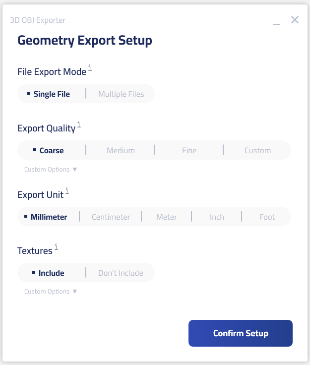 Multiple File Formats: Effortlessly export geometrical information as OBJ and MTL files, ensuring compatibility with a wide range of 3D modelling and VR applications.