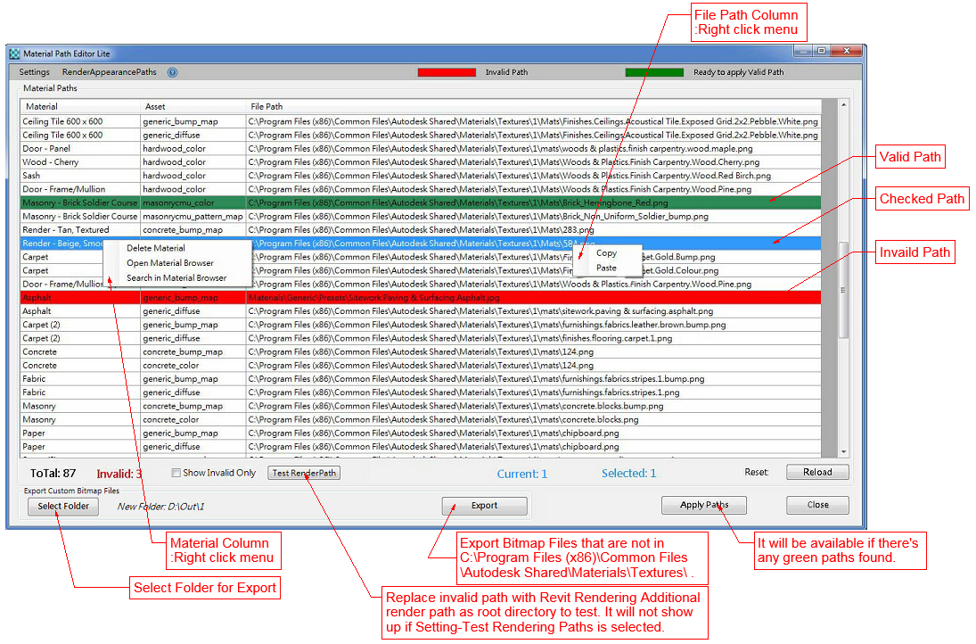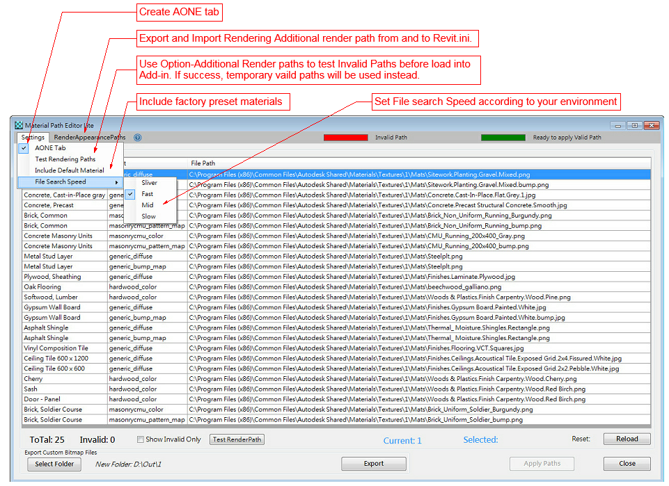 For Autodesk® Revit® prior 2021 version, it might be the fastest way for you to edit missing bitmap files. Because it has the ability to quickly identify missing bitmap files, which may take a couple of minutes for the default material browser to bring them up. There is an extra function for you to export your custom bitmap files to a specific location. It is helpful for sending your Revit file with custom bitmap files to outside consultants. It also has a function for you to export or import your custom rendering paths from or to Revit.