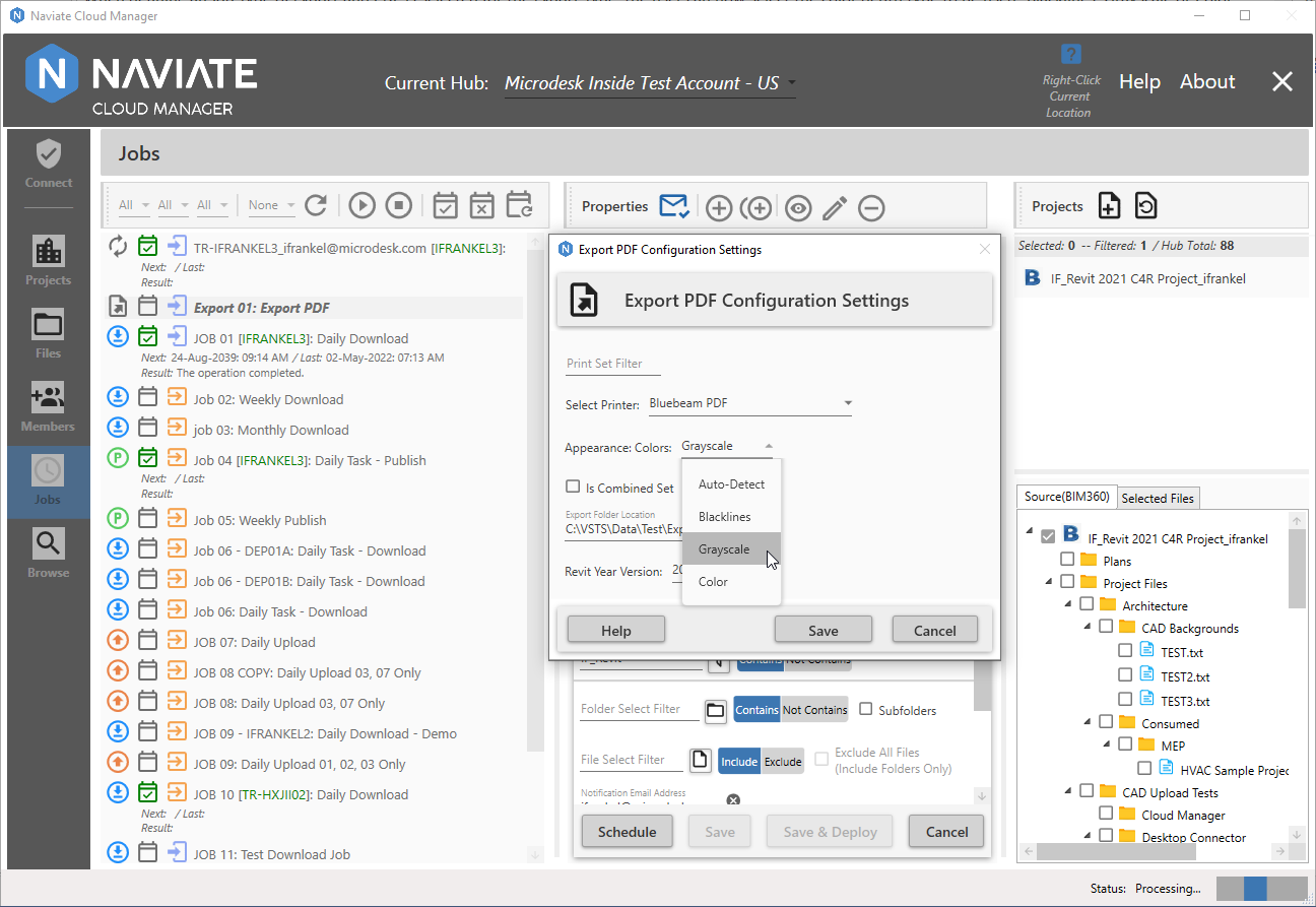 Naviate Cloud Manager (Formerly BIMrx Cloud Manager) saves time while managing Autodesk Construction Cloud® (ACC) and Autodesk® BIM 360® so you can focus on high-value tasks like digital transformation and sustainability. The tasks of managing multiple projects simultaneously are streamlined, including project creation, and member management. Additionally, you can automate exporting PDF/NWC/DWG from Autodesk® Revit®, publishing cloud Revit models, file uploads, and archive snapshot backups or download syncs by scheduling these tasks for multiple projects in bulk.