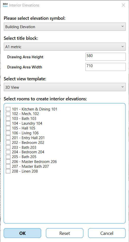 - Create interior elevation markers by selecting rooms and place the newly created views on sheets. It will completely remove the tedious task of manually placing interior elevation markers and dragging these views onto sheets.