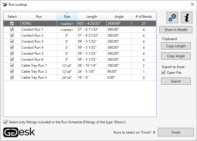 Run Lookup is a streamlined add-in for Autodesk® Revit® that simplifies the calculation of the total length for selected conduit or cable tray runs. By factoring in angle bends in its calculations, Run Lookup excels in scenarios where the length or angle of a conduit run may be constrained.