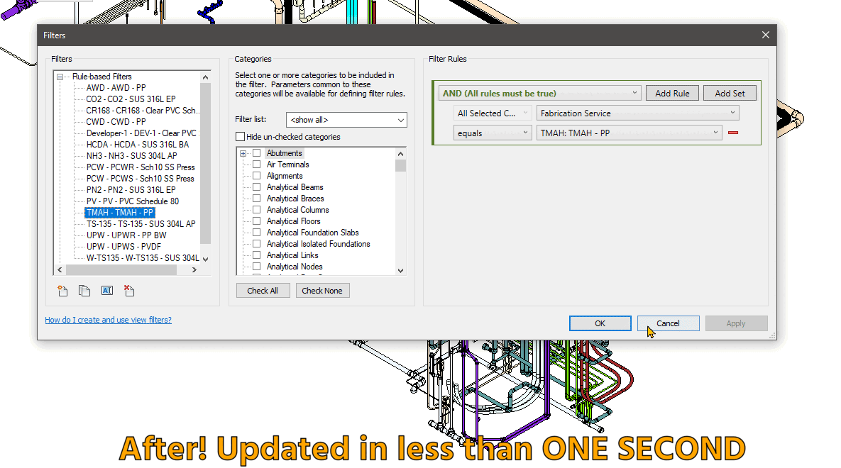 - Reduce or eliminate errors in the view filters. Nothing gets missed. All services in the project are added, even the ones that haven’t been modeled yet. The names of the service filters may be altered to replace characters that are illegal in Revit’s interface. If the service already has a filter of the same name, it does not get duplicated.
