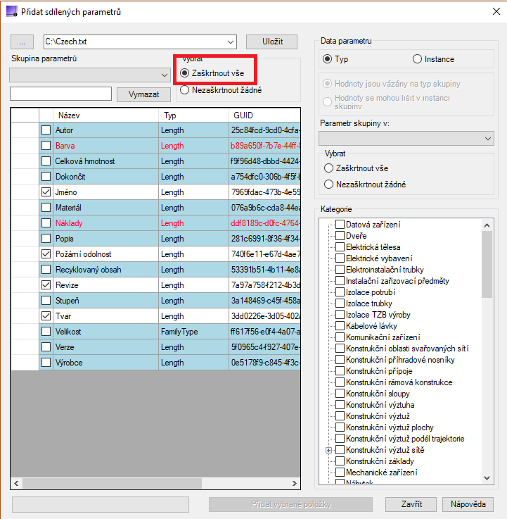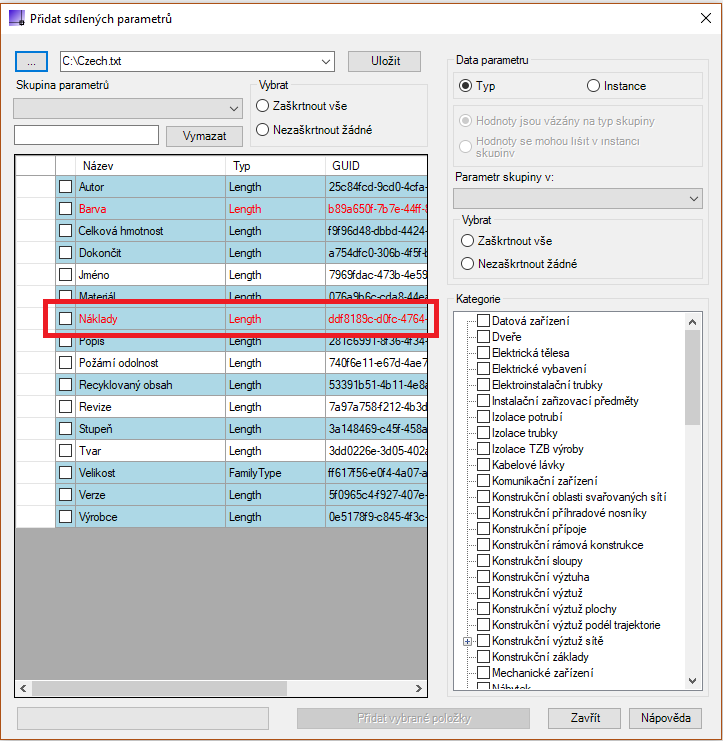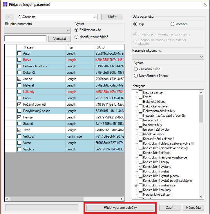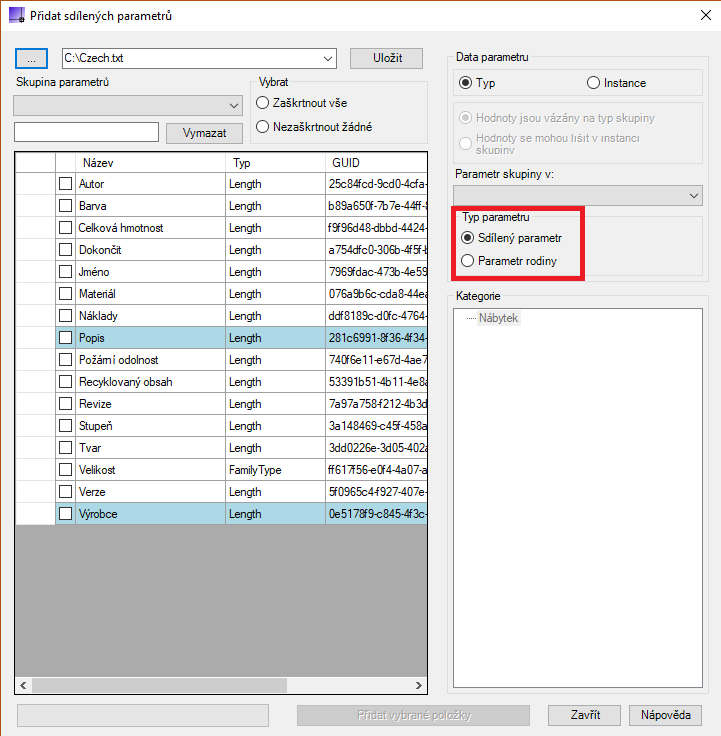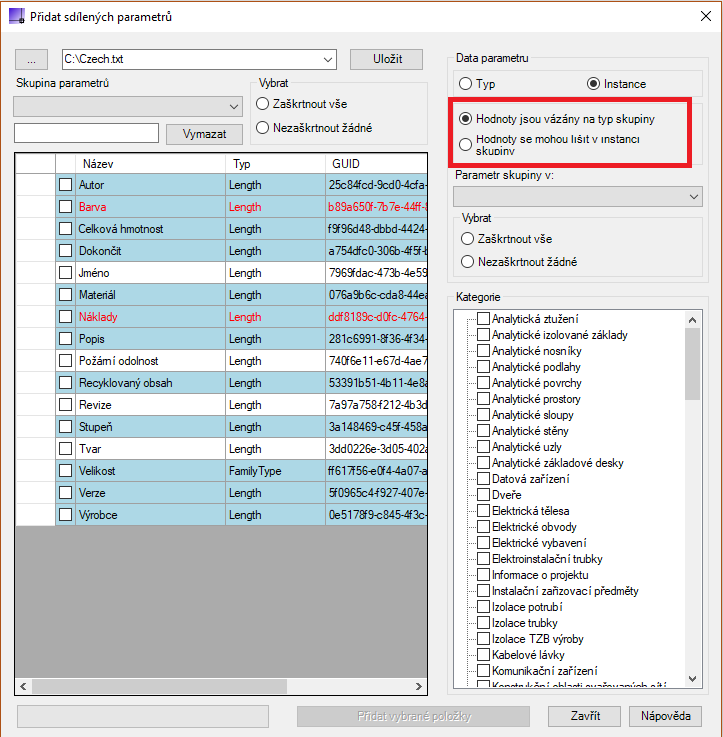 Také dokládá parametry, které již existují v rámci aktivního dokumentu a zastaralé parametry, které nejsou vázány na kategorie.