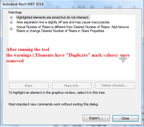 This tool is designed to remove duplicate mark warnings from the Autodesk® Revit® files.