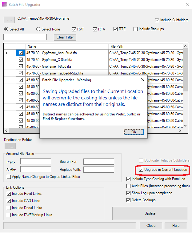 Using this app, you can upgrade multiple Autodesk® Revit® Projects (*.rvt), Templates (*.rte) or Families (*.rfa) to the most current version. Excludes Workshared Projects.