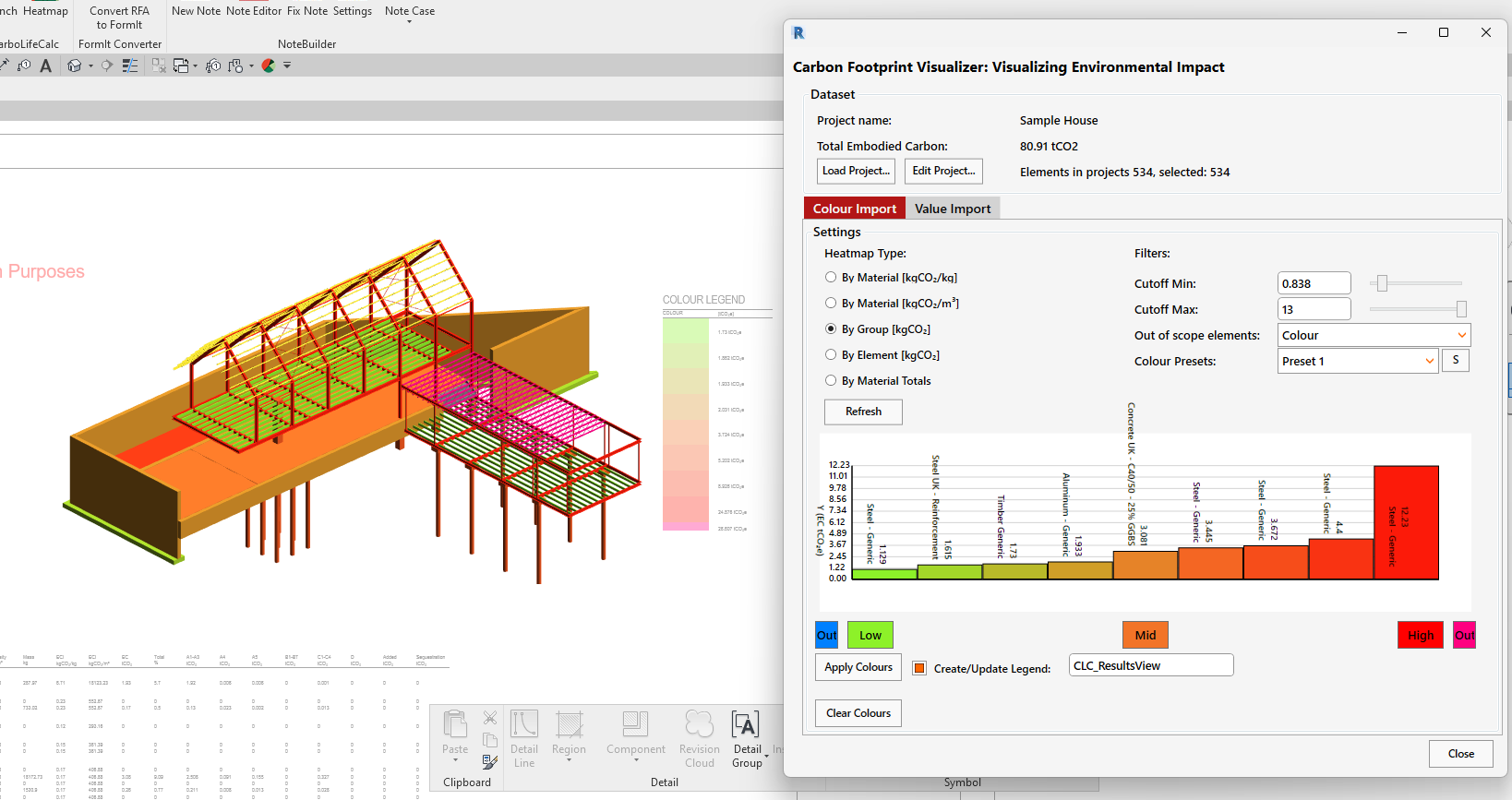Using this tool allows anybody to calculate the embodied carbon of a design while giving full freedom to the user to select materials, edit, or expand the material database to report and optimize the embodied carbon. As a Revit plugin, you will also be able to create "heatmaps" from the calculation results, making it just a press of a few buttons to create some great 3D visualizations to show the embodied carbon. You can also export the embodied carbon values back as a parameter into the Revit elements and use in-Revit schedules in ways of your liking. Or why not export the entire database to csv format and create your own graphs and reports as you wish. There are many ways the Carbo Life Calculator can be of use: