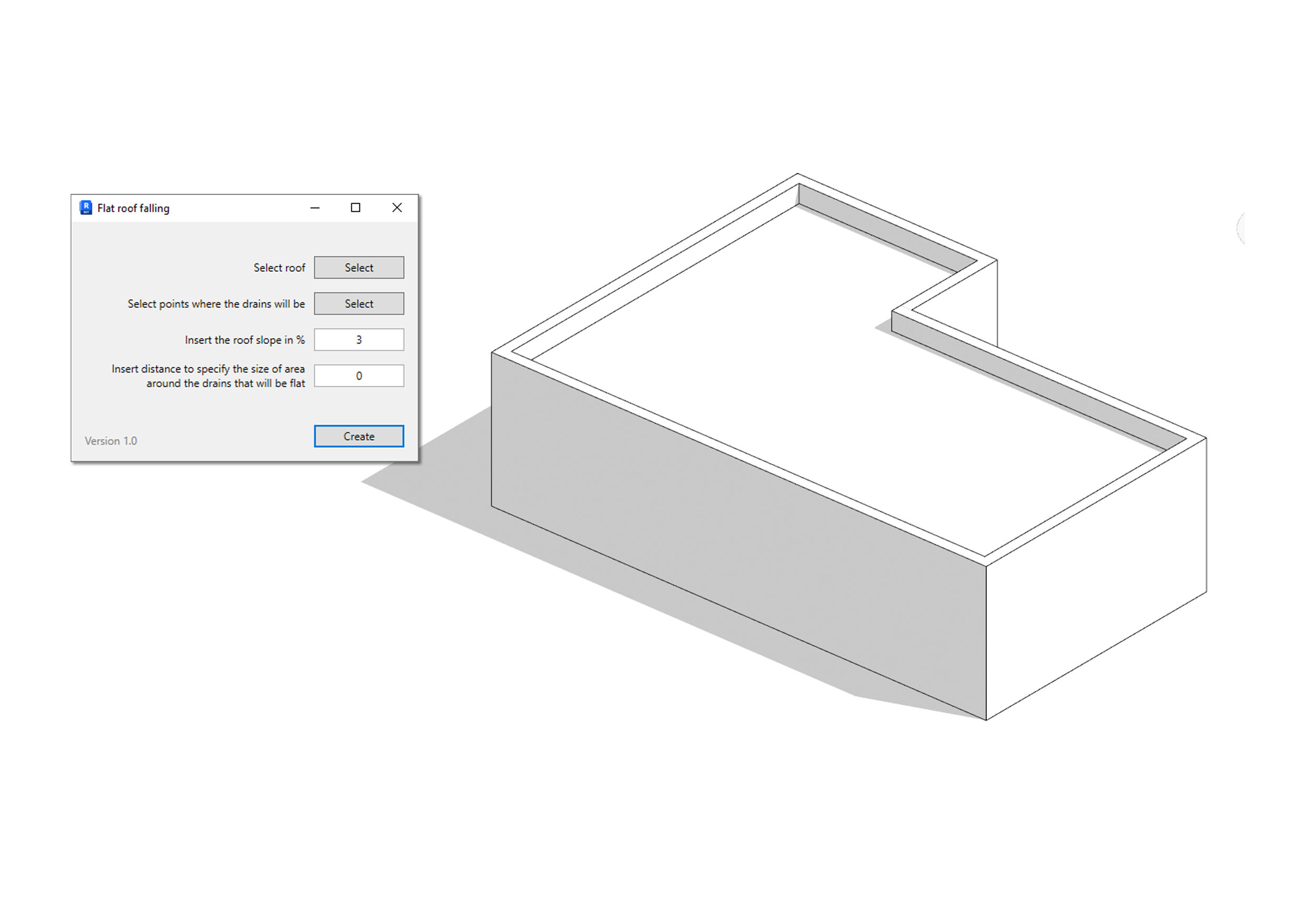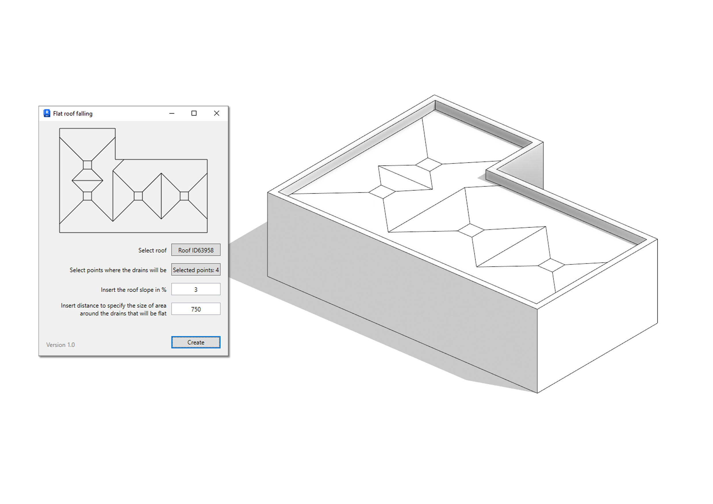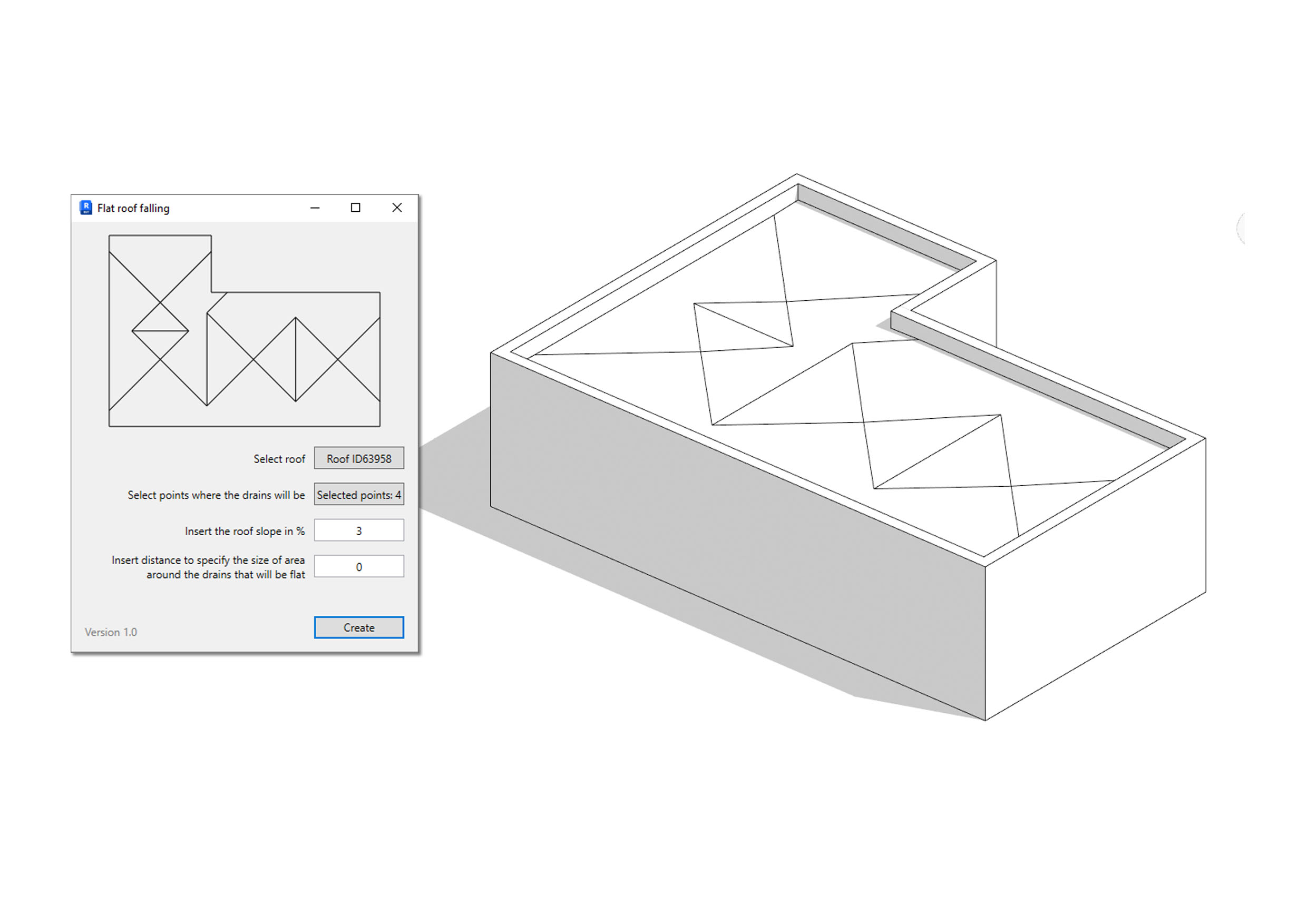 The Roof Generator tool is designed to simplify and speed up the modeling of a flat roof‘s slope for drainage. Simply select the drainage points, set the slope and the tool will automatically adjust the roof so that all roof planes have a constant slope towards the drainage points.