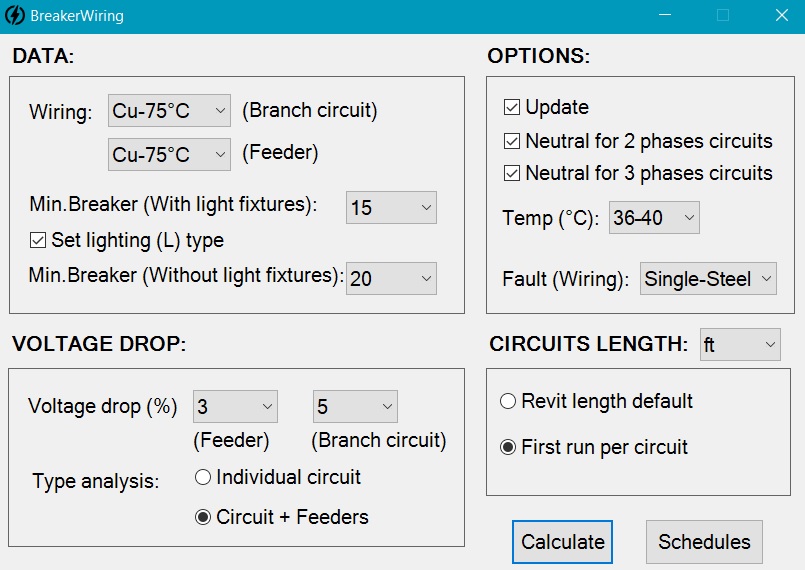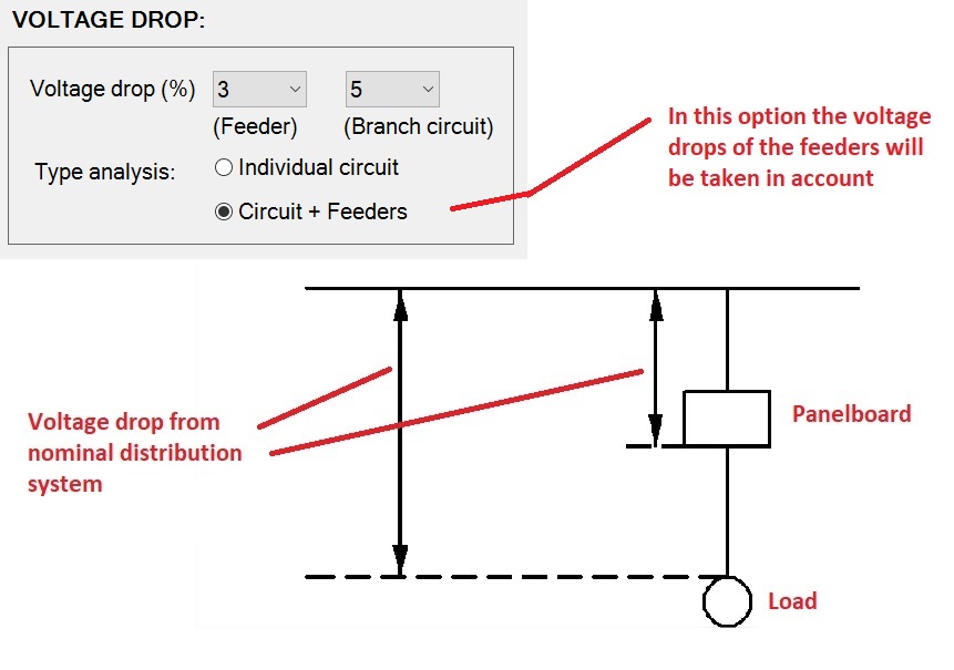 - Voltage drops: Data percentage of voltage permissible drop: 0.5 % to 5 %, it can be manually changed by the user, and this calculation can be done individually per circuit or