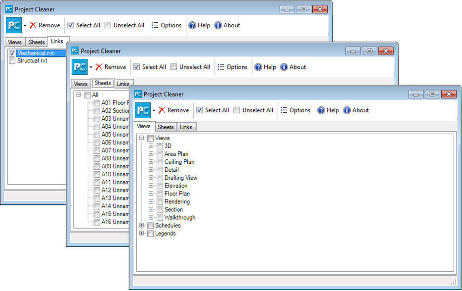 This tool deletes views, sheets, schedules, legends and Revit links, which can be useful for preparing projects to send off to consultants.