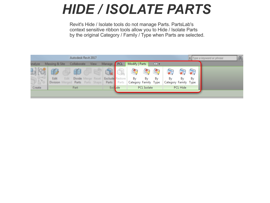 - Context ribbon tools that Hide/Isolate Parts by original categories/families/types