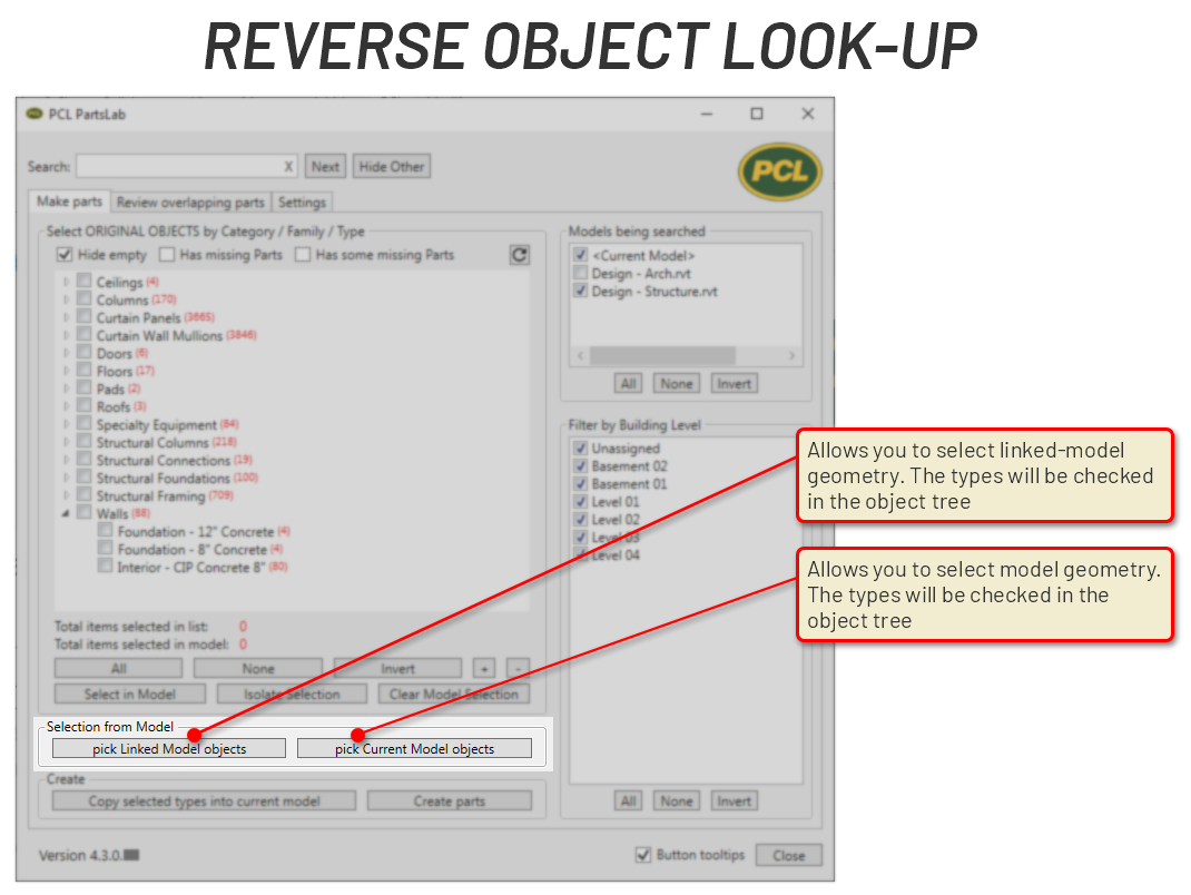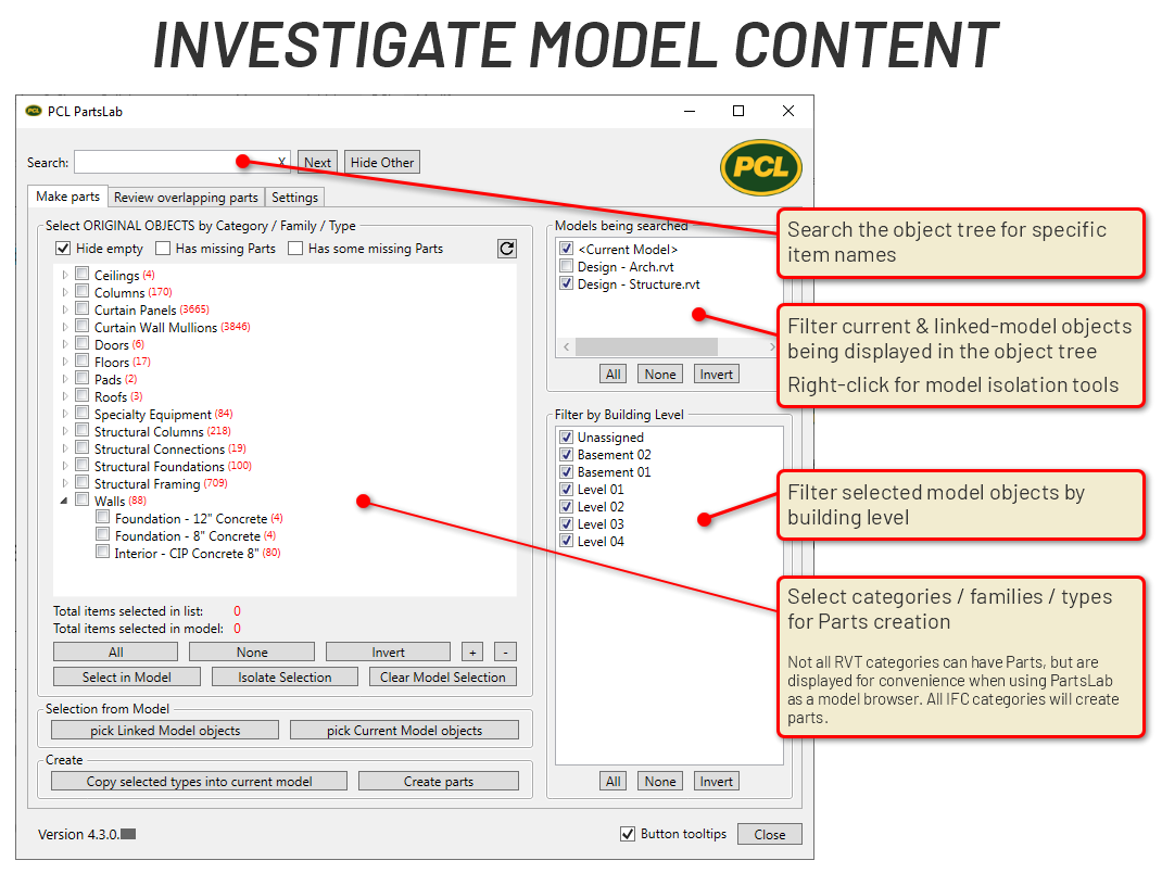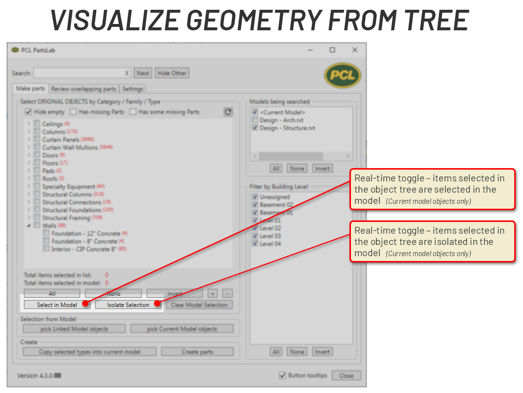 Revolutionize your Concrete Construction Model Workflow! If you manage Autodesk® Revit® construction models, this addin will significantly improve how you directly leverage design model geometry. PCL PartsLab® is a free Revit model browser that automates the creation, visualization, and change management of Revit Parts. Drastically reduce time and clicks by instantly creating thousands of Parts from targeted categories/families/types. Context sensitive visualization tools assist in quick hiding & isolation. Isolation tools show overlapping Parts to reveal design issues. The managed history view helps you keep track of what Parts were created during each design update.