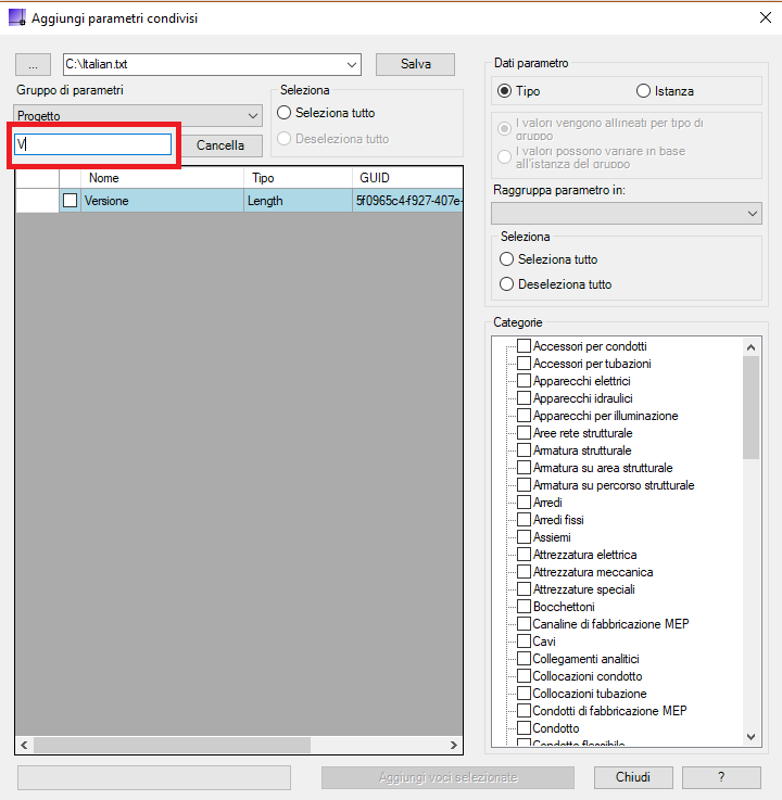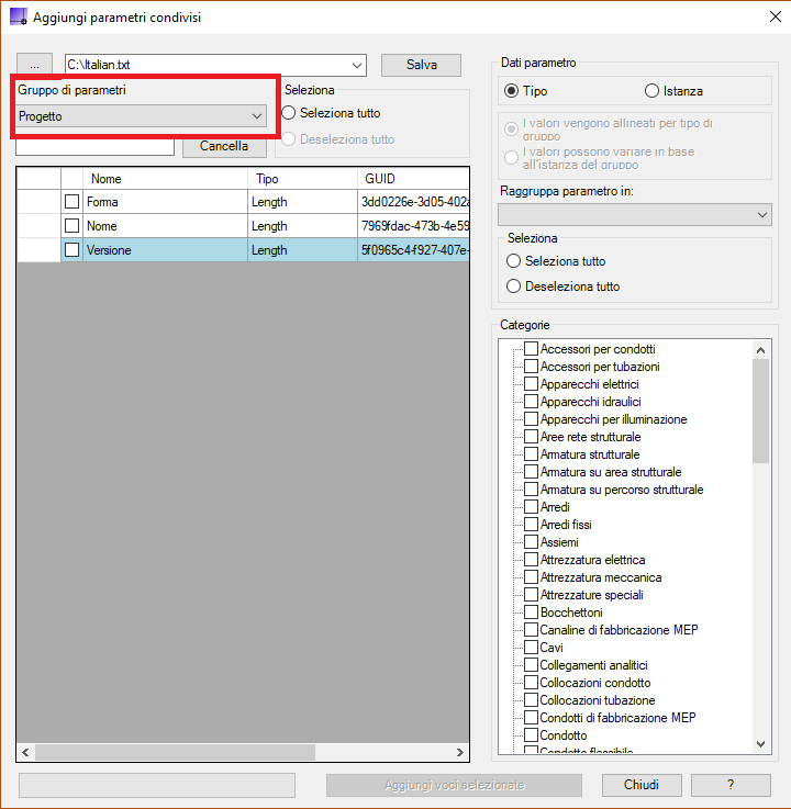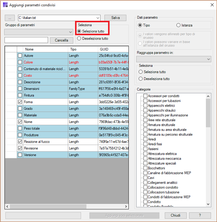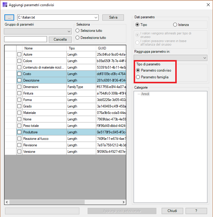 Si evidenzia anche i parametri già esistenti all'interno del documento attivo e parametri obsoleti, che non sono associati a una categorie.