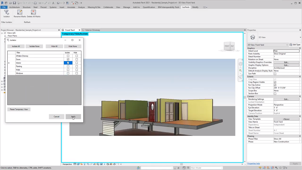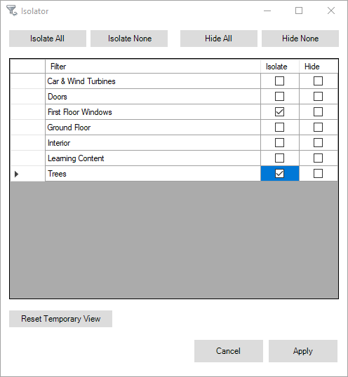 You can select one or more Revit filters from a grid and you can choose if you want to temporarily isolate or hide the instances of the filters in the active view.