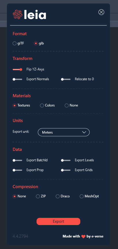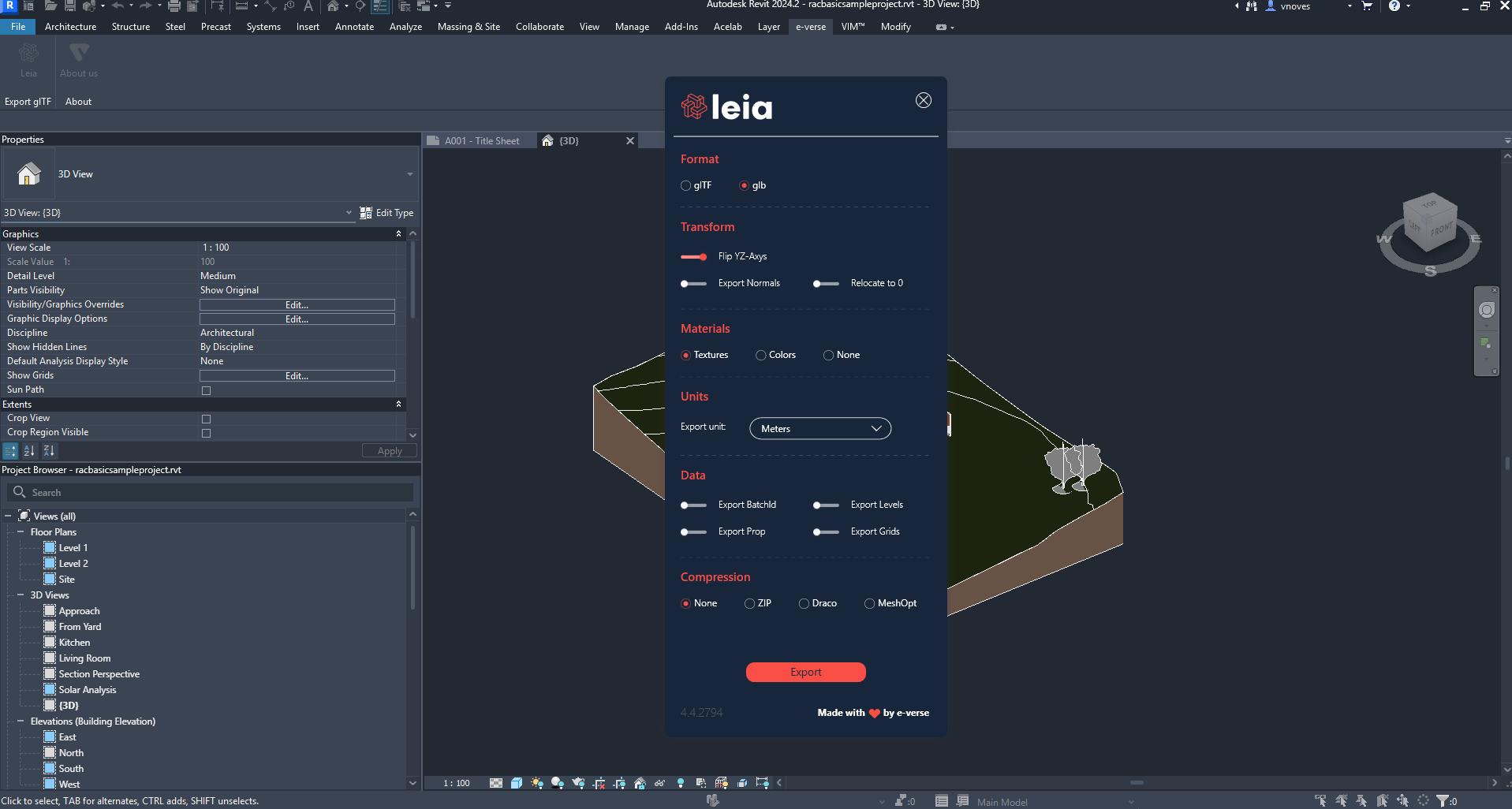 Leia is a glTF exporter for Autodesk® Revit®. Export any 3D model to use in the cloud or in any other tools.