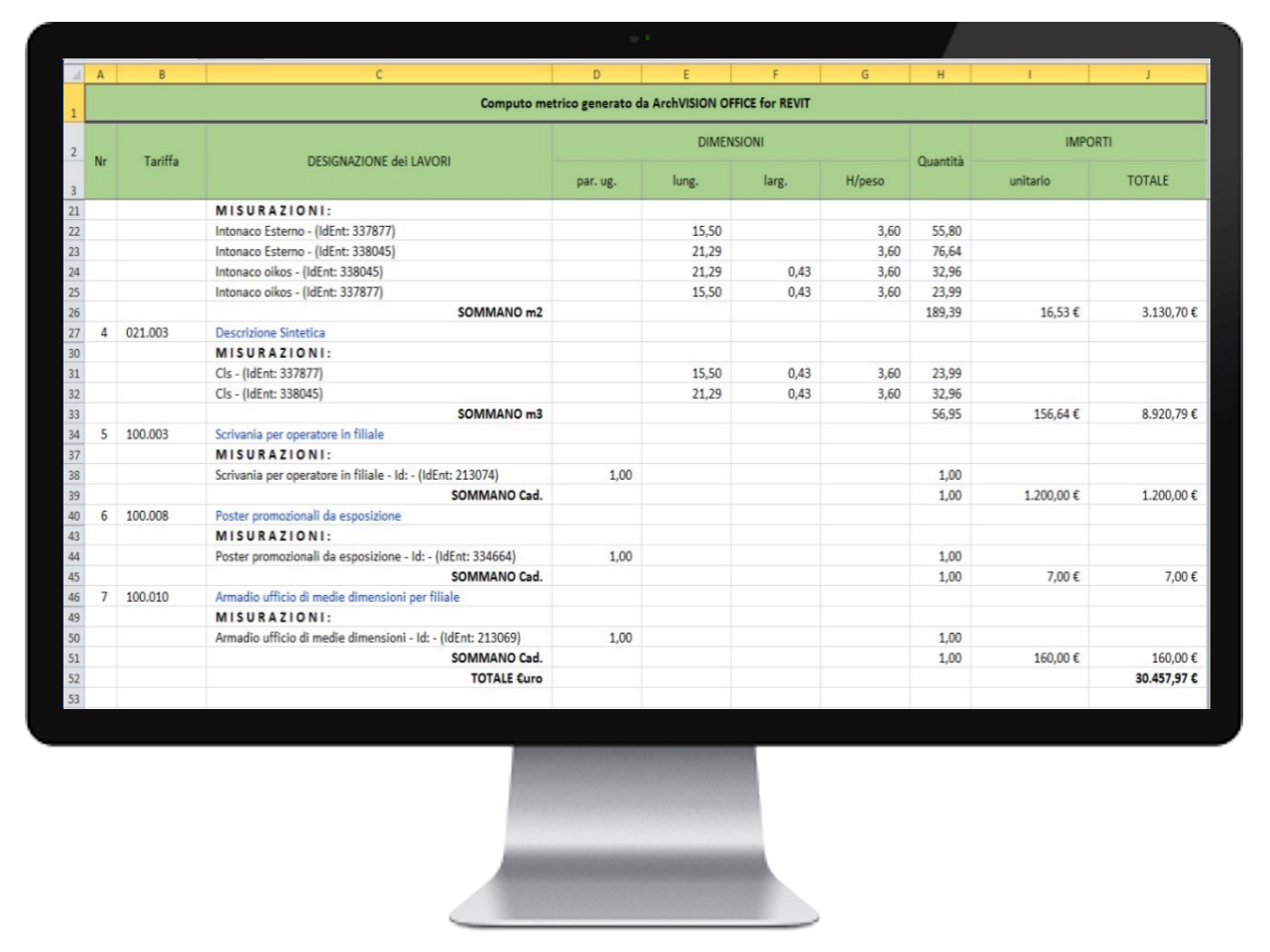 ArchVISION OFFICE for Revit is the application product of MCS Software specifically designed for the dynamic and direct calculation in Office® (starting from Ver. 2007 up to the latest Microsoft® Office 365) of projects carried out in Revit Architecture, Structure, and Mep by Autodesk (2026 - 2021) in It, En, De, Es and Fr.