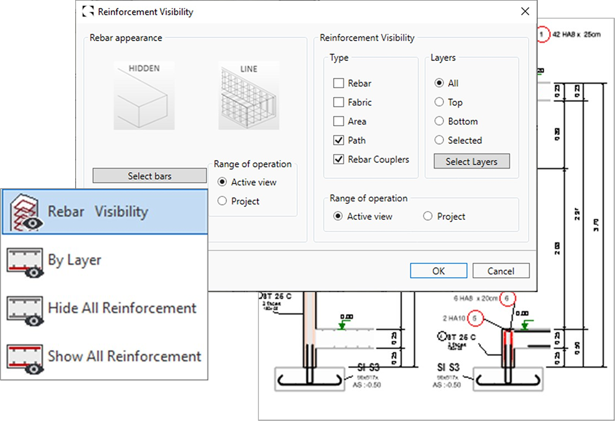 Setting rebar visibility in Revit can be a time-consuming job, newly created reinforcement will not automatically inherit the existing view settings. Graitec has created several tools to optimize and control the visibility of reinforcement. The Browse Reinforcement command enables users to browse all reinforcement through filters based on rebar parameters ( type, partition, mark, shape, diameter…) and highlights all corresponding instances in the view