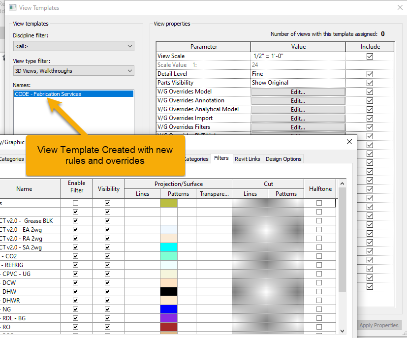- With a single click, build hundreds of filters and a view template in under one second. Filter rules are generated for each service and applied to the common MEP Fabrication categories. The new service filters are added to the current view, each with a solid color override. Finally, the current view is saved into a new view template.
