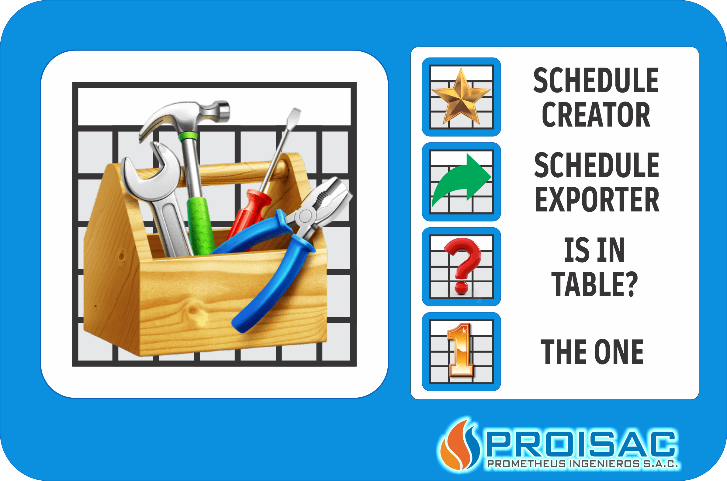 Take your work to a new level by using SCHEDULE TOOLBOX to create in seconds dozens of Schedules, export one or all your Schedules to a single Excel file, analyze and validate your Schedules to be trusted, and consolidate all your data in one single table (BIG DATA).