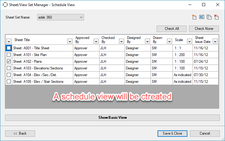 In Basic View, you could save, save as, rename, or delete a sheet set similar to Autodesk® Revit®, the difference is the "Hide un-check" button.