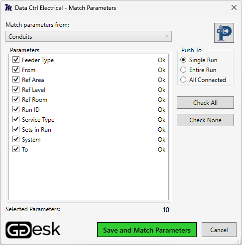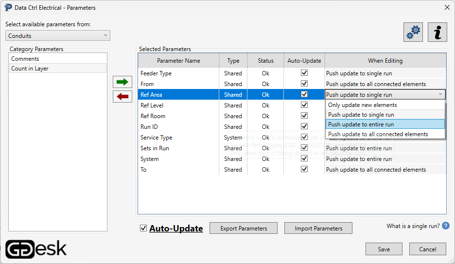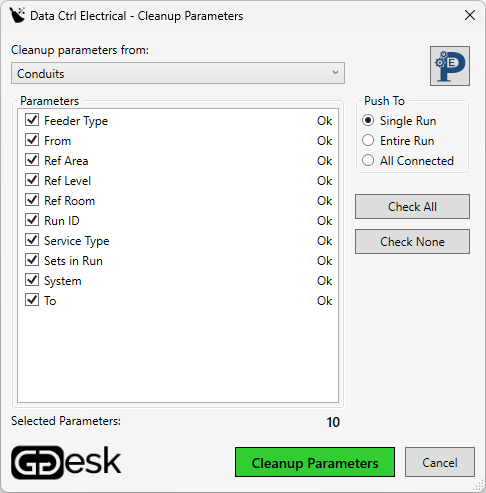 Data Ctrl automatically pushes parametric information through the entire electrical network, maintaining up-to-date parameter values as you modify the network's elements. Data Ctrl also pushes the parameter values to the Run Schedule. Any changes made to the Run Schedule are transferred accordingly to the conduit or cable tray network.